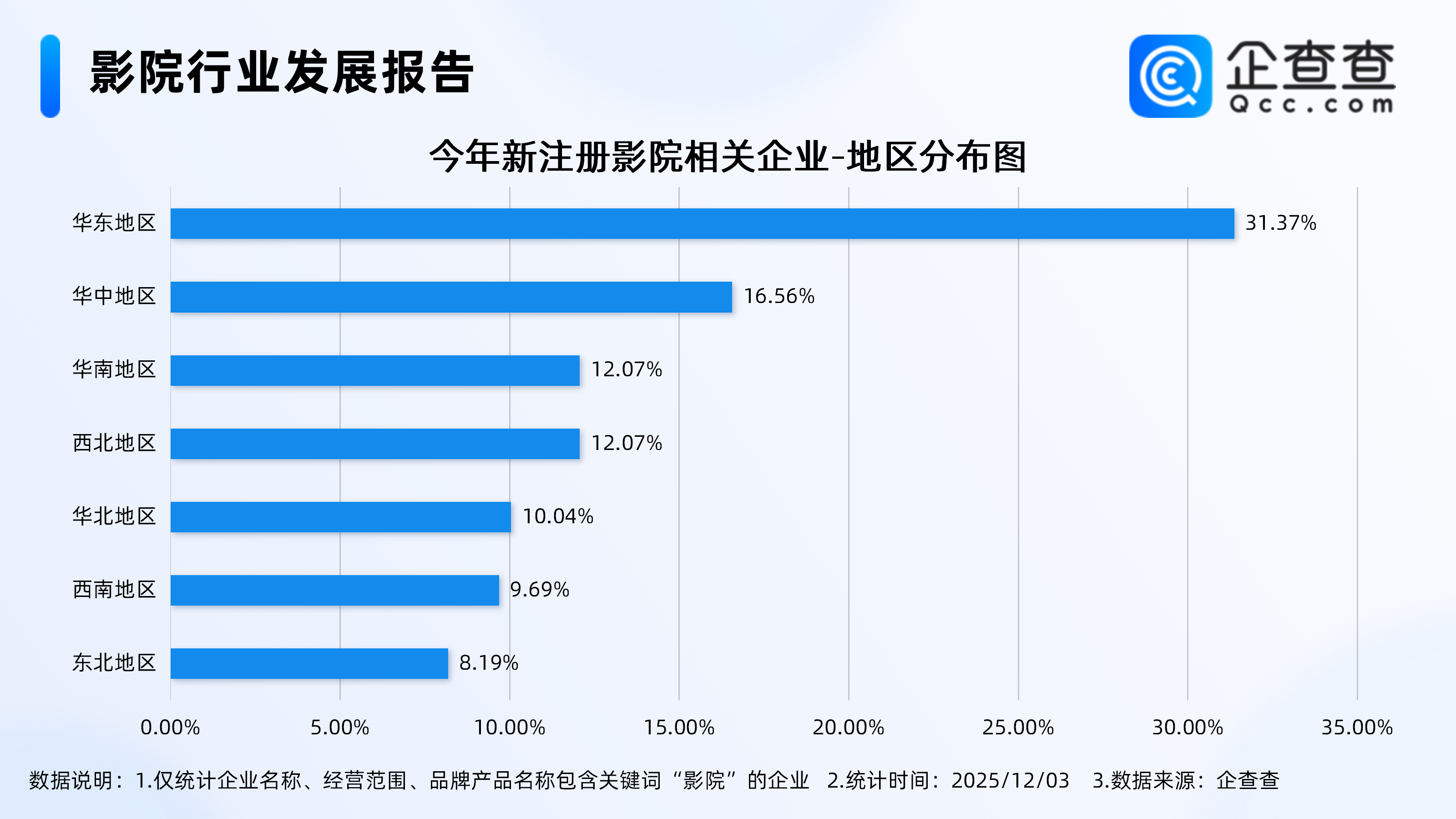 企查查数据显示,从地区分布来看,今年新注册的影院相关企业多分布在华东地区,占比31.37%。其次,华中地区、华南地区新注册相关企业贡献率分别为16.56%、12.07%。