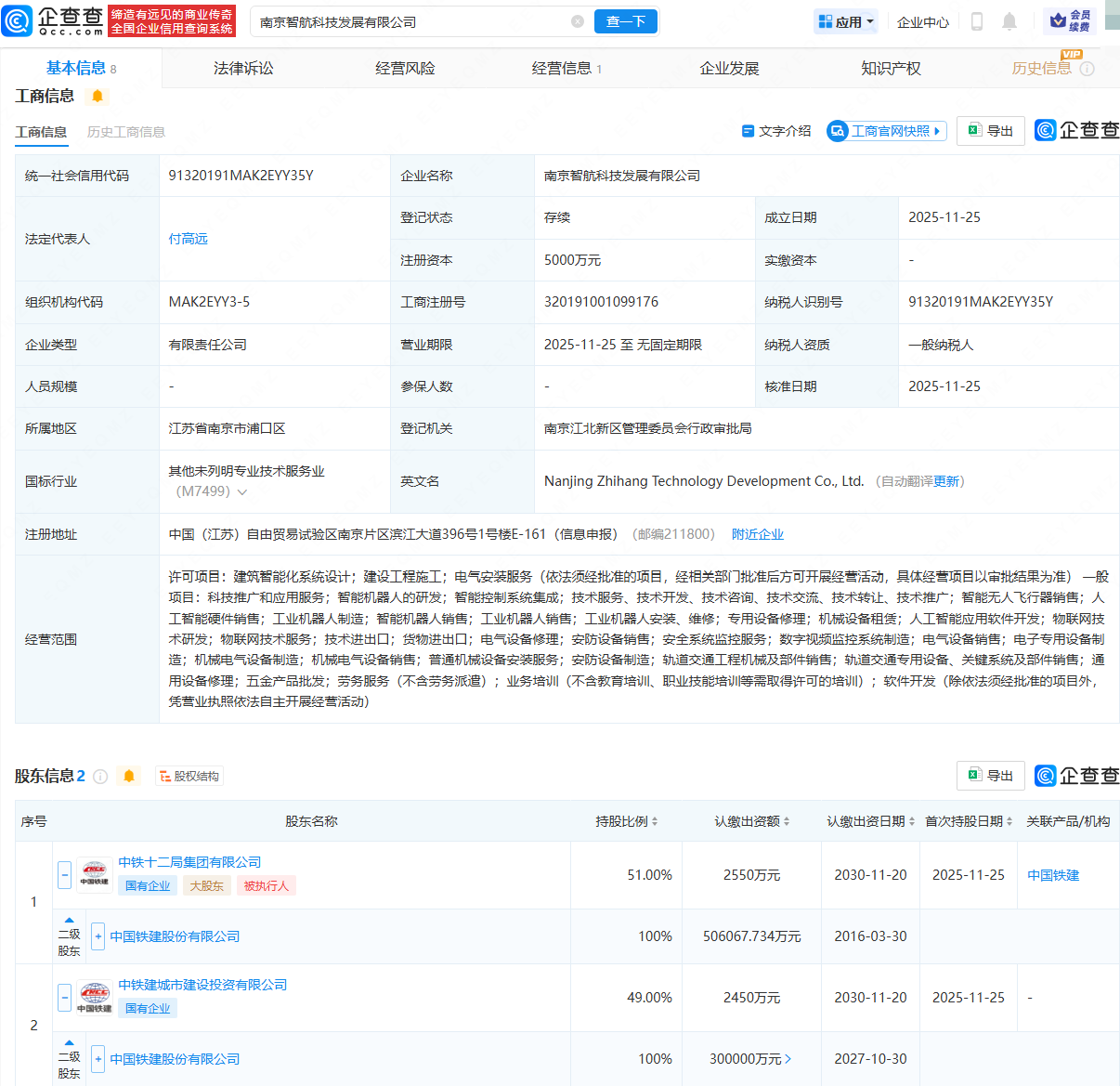 企查查APP显示,近日,南京智航科技发展有限公司成立,法定代表人为付高远,注册资本为5000万元,经营范围包含:智能机器人的研发;智能控制系统集成;智能无人飞行器销售;人工智能硬件销售等。企查查股权穿透显示,该公司由中国铁建(601186)间接全资持股。
