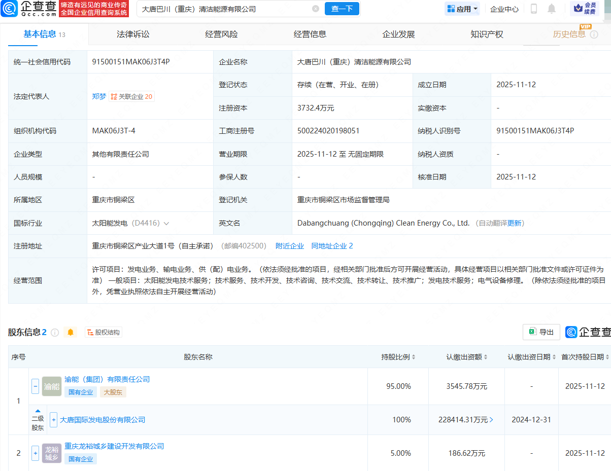 企查查APP显示,近日,大唐巴川(重庆)清洁能源有限公司成立,法定代表人为郑梦,注册资本为3732.4万元,经营范围包含:发电业务、输电业务、供(配)电业务;太阳能发电技术服务;发电技术服务等。企查查股权穿透显示,该公司由大唐发电(601991)全资子公司渝能(集团)有限责任公司、重庆龙裕城乡建设开发有限公司共同持股。