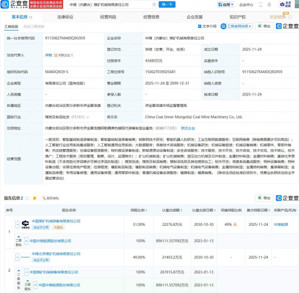 企查查APP显示,近日,中煤(内蒙古)煤矿机械有限责任公司成立,法定代表人为梁敏,注册资本约为4.37亿元,经营范围包含:智能基础制造装备制造;物联网技术研发;智能机器人的研发;工业互联网数据服务等。企查查股权穿透显示,该公司由中煤能源(601898)旗下中国煤矿机械装备有限责任公司、中煤北京煤矿机械有限责任公司共同持股。