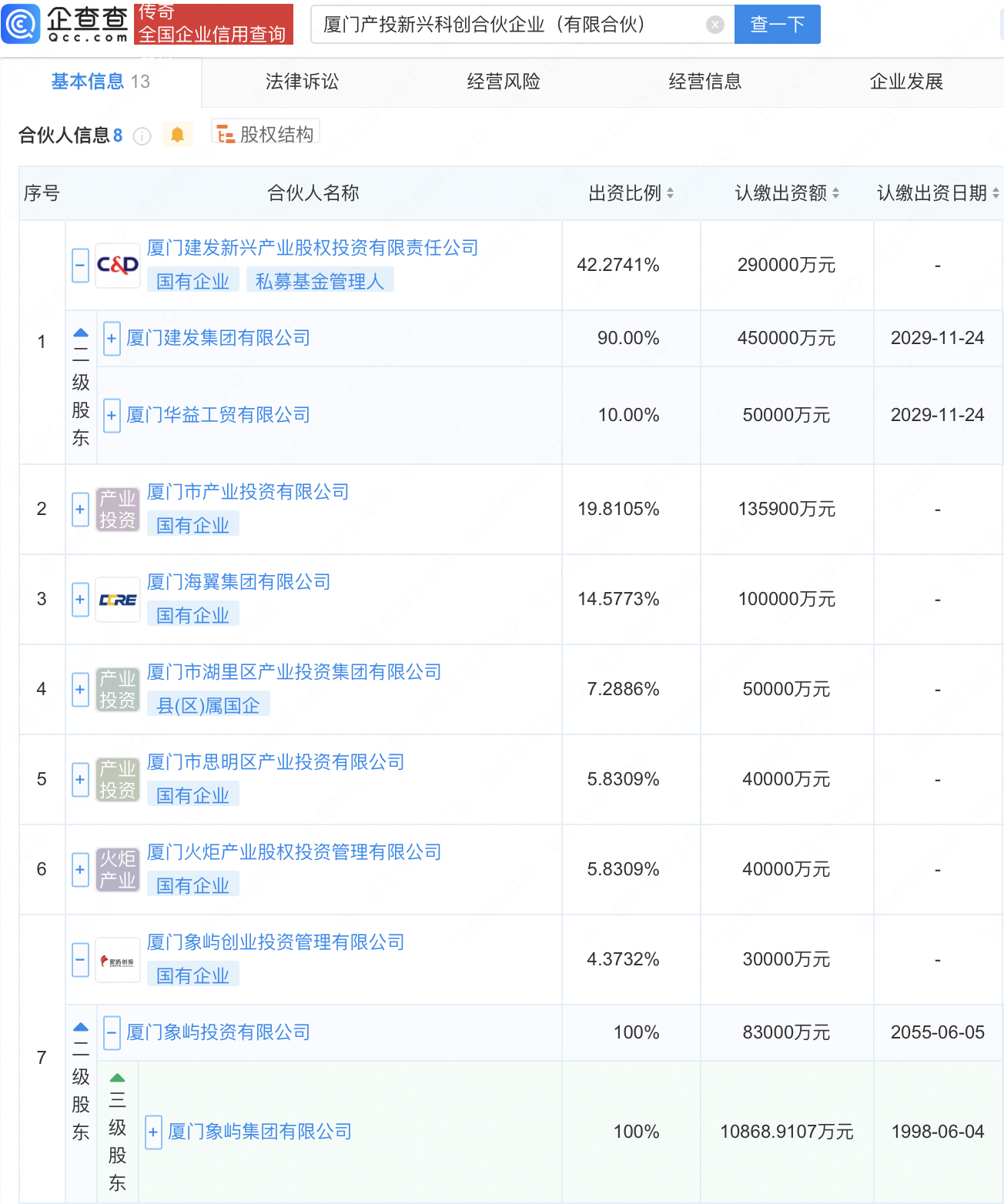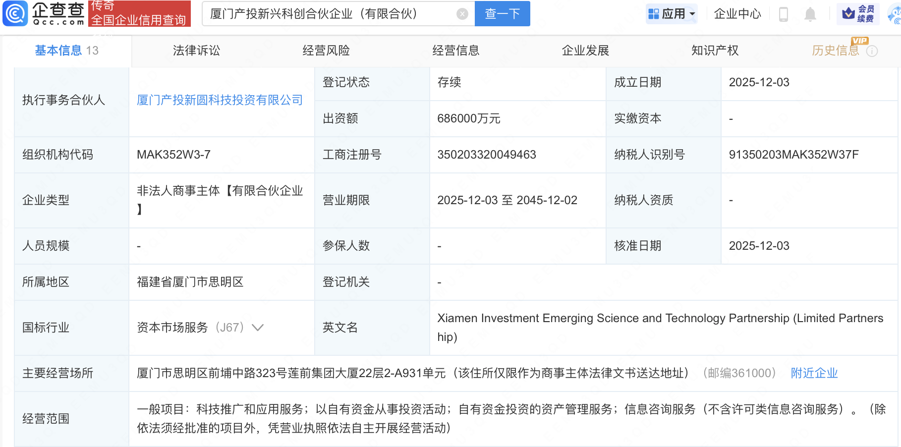 企查查APP显示,近日,厦门产投新兴科创合伙企业(有限合伙)成立,出资额68.6亿元,经营范围包含:科技推广和应用服务;以自有资金从事投资活动;自有资金投资的资产管理服务;信息咨询服务(不含许可类信息咨询服务)。企查查股权穿透显示,该企业由厦门建发集团有限公司旗下厦门建发新兴产业股权投资有限责任公司、厦门象屿集团有限公司旗下厦门象屿创业投资管理有限公司等共同出资。