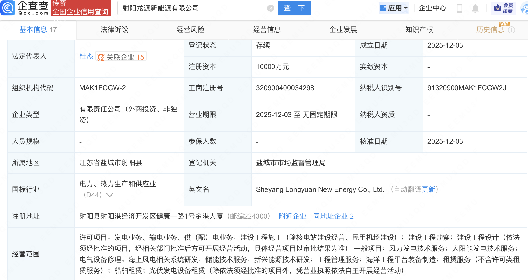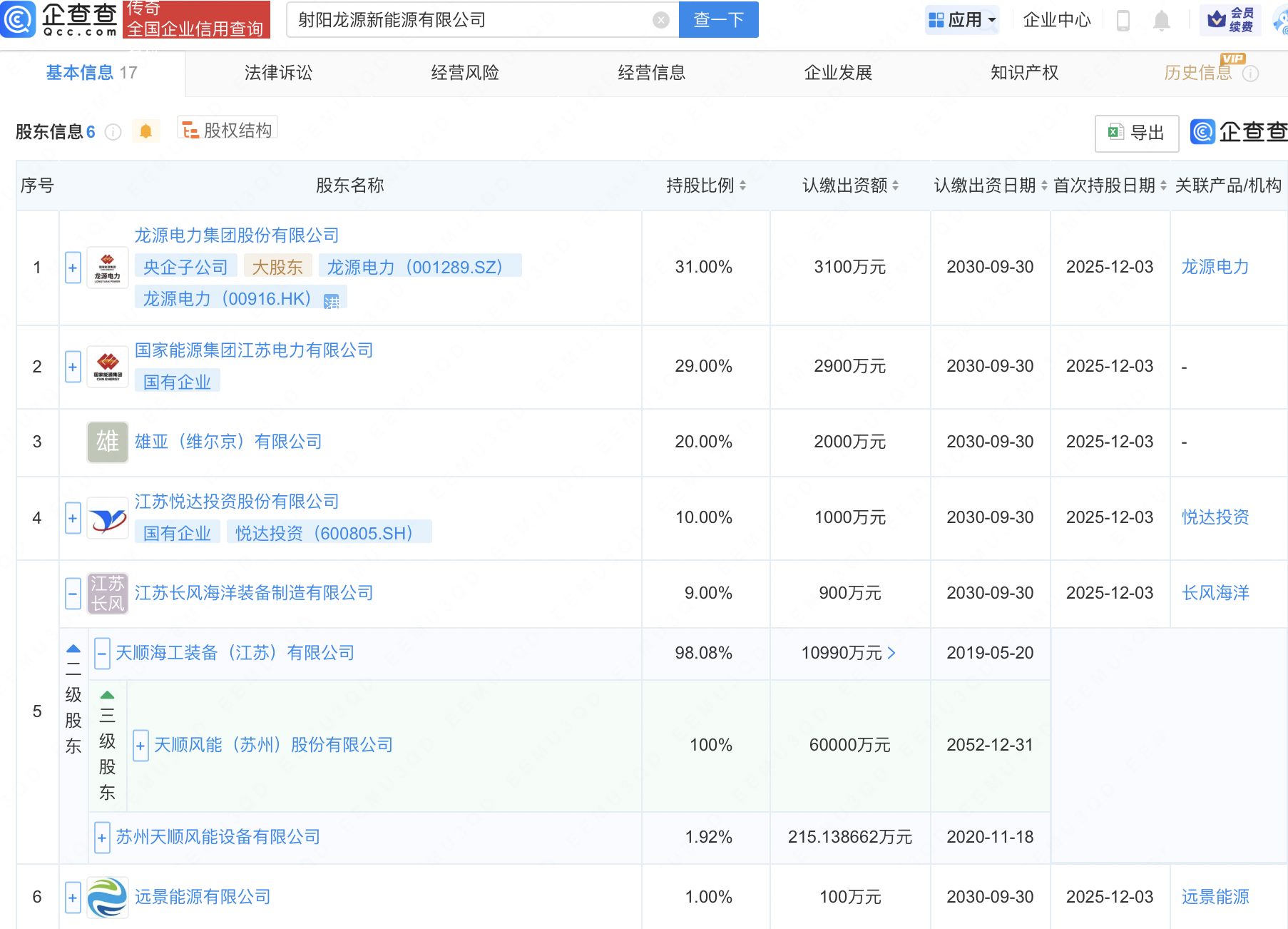 企查查APP显示,近日,射阳龙源新能源有限公司成立,注册资本1亿元,经营范围包含:风力发电技术服务;太阳能发电技术服务;电气设备修理;海上风电相关系统研发等。企查查股权穿透显示,该公司由龙源电力(001289)、国家能源集团江苏电力有限公司、悦达投资(600805)、天顺风能(002531)旗下江苏长风海洋装备制造有限公司、远景能源有限公司等共同持股。