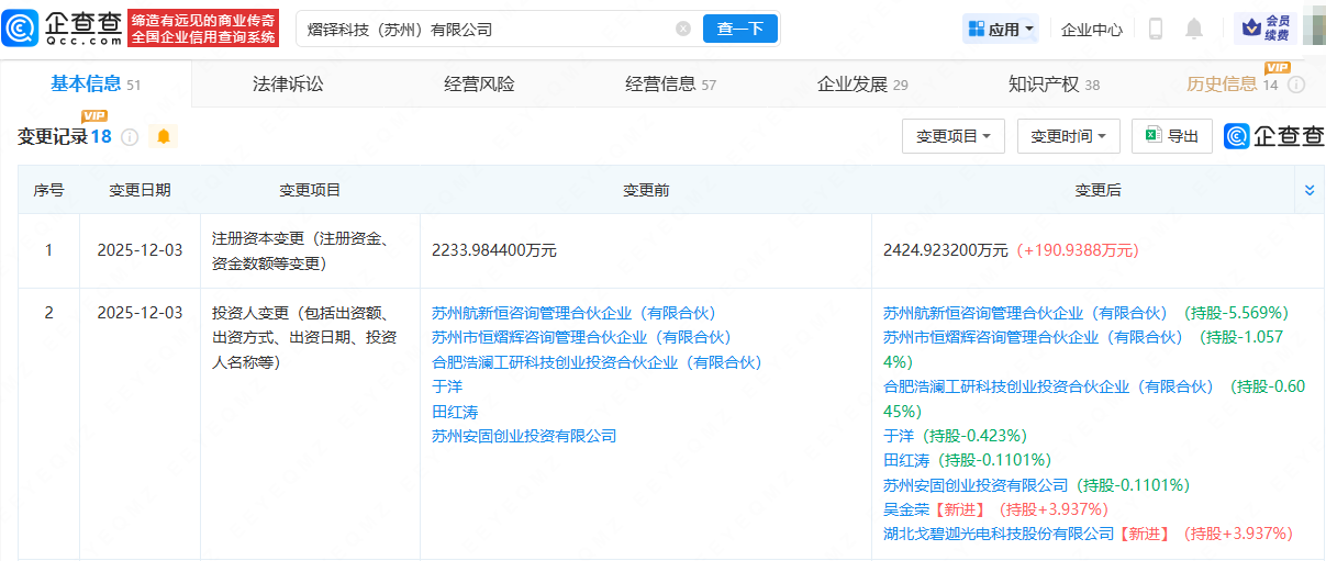 企查查APP显示,近日,熠铎科技(苏州)有限公司发生工商变更,新增戈碧迦(920438)等为股东,同时注册资本增至2424.92万元。企查查信息显示,该公司成立于2022年,法定代表人为李居知,经营范围包含:集成电路芯片及产品制造;集成电路芯片及产品销售;半导体分立器件制造;半导体分立器件销售等。据其官网,熠铎科技专注于半导体先进封装及高阶功率器件行业所需的高精度、高强度玻璃载板、TGV基板的研发和产业化。