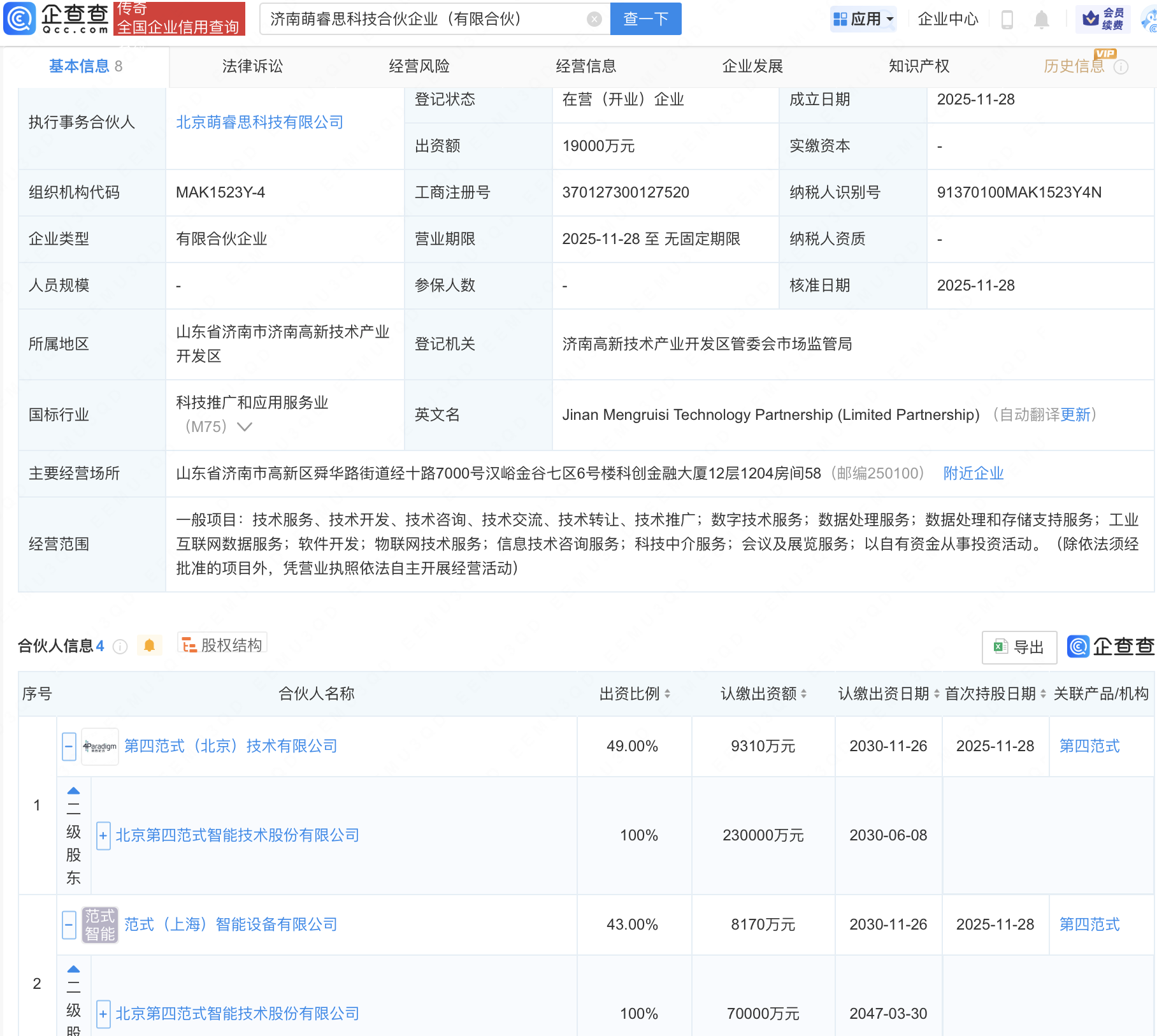 企查查APP显示,近日,济南萌睿思科技合伙企业(有限合伙)成立,出资额1.9亿元,经营范围包含:数字技术服务;数据处理服务;数据处理和存储支持服务;物联网技术服务等。企查查股权穿透显示,该企业由第四范式(06682.HK)全资子公司第四范式(北京)技术有限公司、范式(上海)智能设备有限公司等共同出资。