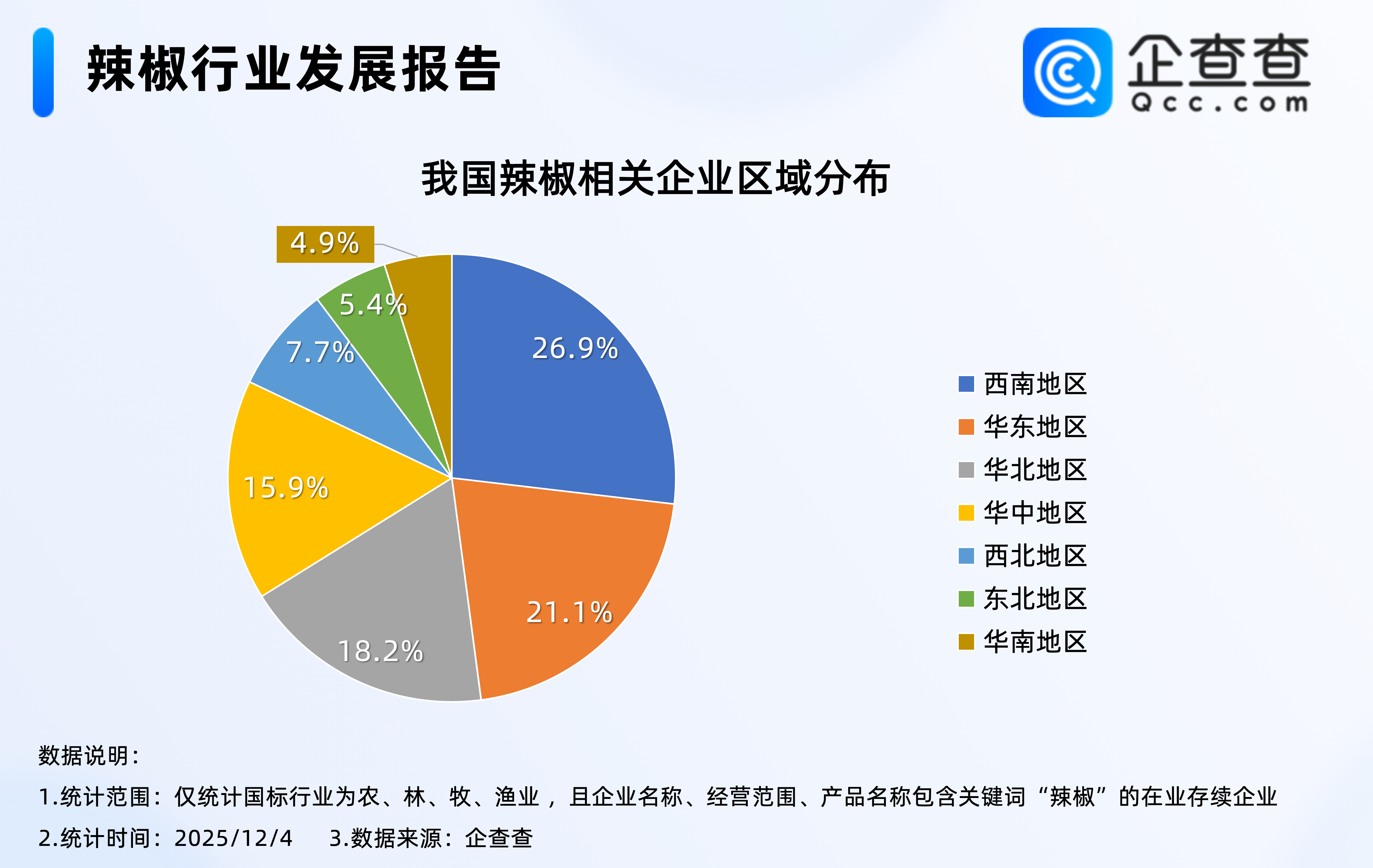 企查查数据显示,截至12月4日,我国现存1.40万家辣椒相关企业。区域分布上,我国西南地区现存辣椒相关企业最多,占比26.9%,其次是华东地区,占比21.1%,华南地区辣椒相关企业存量相对最少,占比4.9%。