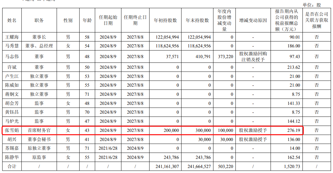 挖贝研究院注意到,辞职的张雪娟去年薪酬达到276.19万元,在公司董监高里薪酬最高,董事长王耀海薪酬90万元,董事、总经理马秀慧薪酬186万元。