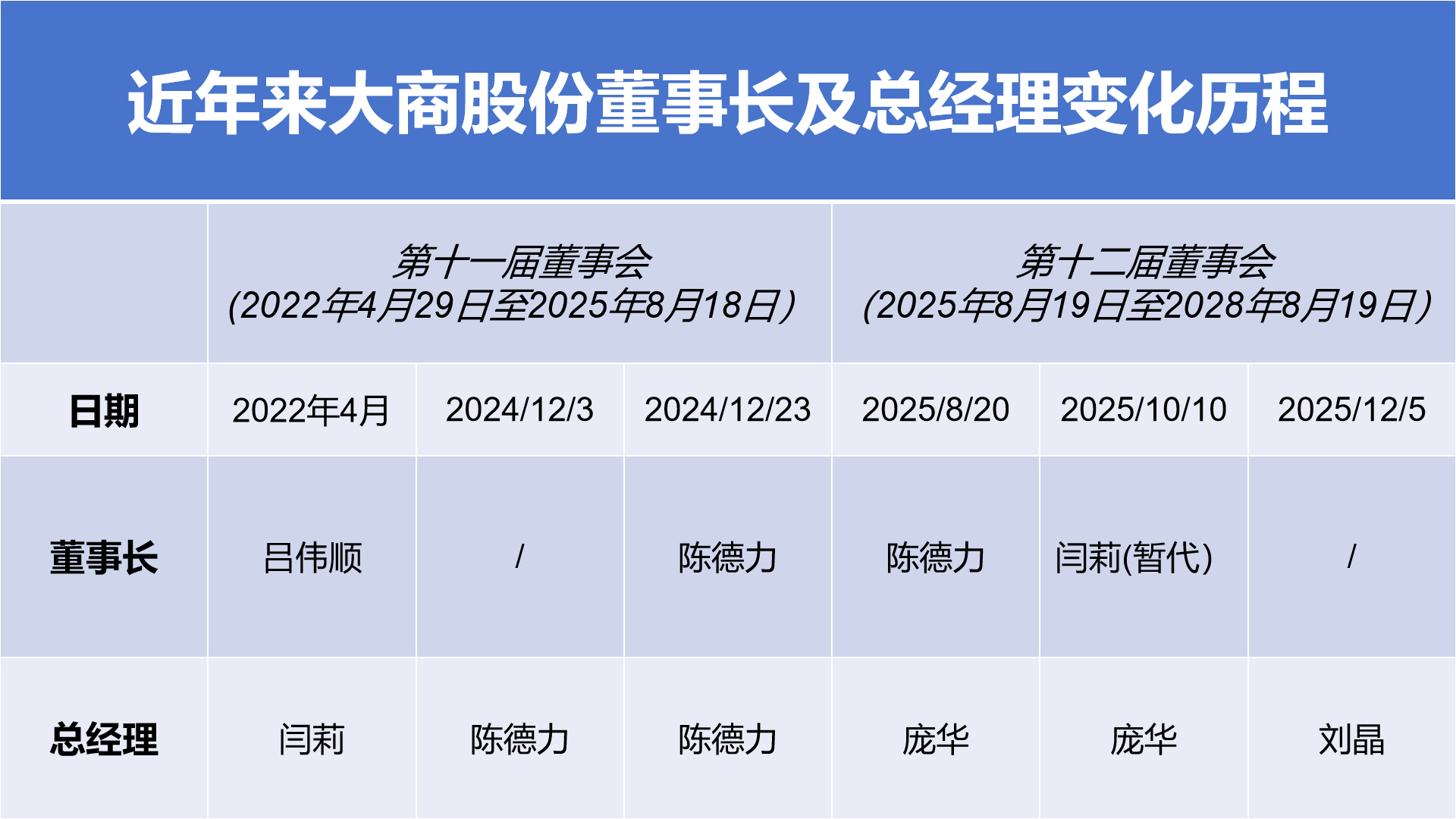 2025年10月,上任不足1年,陈德力因“个人原因”辞去了董事长、CEO职务。为保障董事会运行与经营平稳,大商股份随即启动非独立董事补选。过渡期内,由副董事长闫莉临时履行董事长职责,负责董事会事务;总经理庞华临时履行CEO职责,主持日常经营。