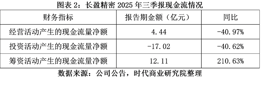 再看现金流量表,2025年前三季度,该公司经营活动产生的现金流量净额、投资活动产生的现金流量净额分别为4.44亿元、-17.02亿元,同比分别下滑40.97%、40.62%;而筹资活动产生的现金流量净额为12.11亿元,同比激增210.63%。