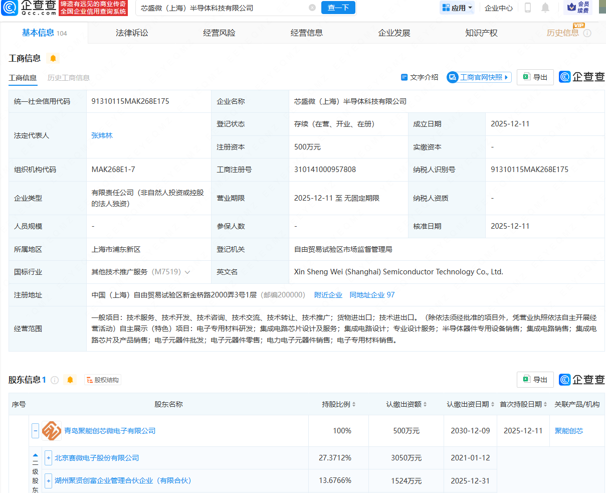 企查查APP显示,近日,芯盛微(上海)半导体科技有限公司成立,法定代表人为张炜林,经营范围包含:电子专用材料研发;集成电路芯片设计及服务;集成电路设计;半导体器件专用设备销售;集成电路销售等。企查查股权穿透显示,该公司由青岛聚能创芯微电子有限公司全资持股,后者由赛微电子(300456)等共同持股。