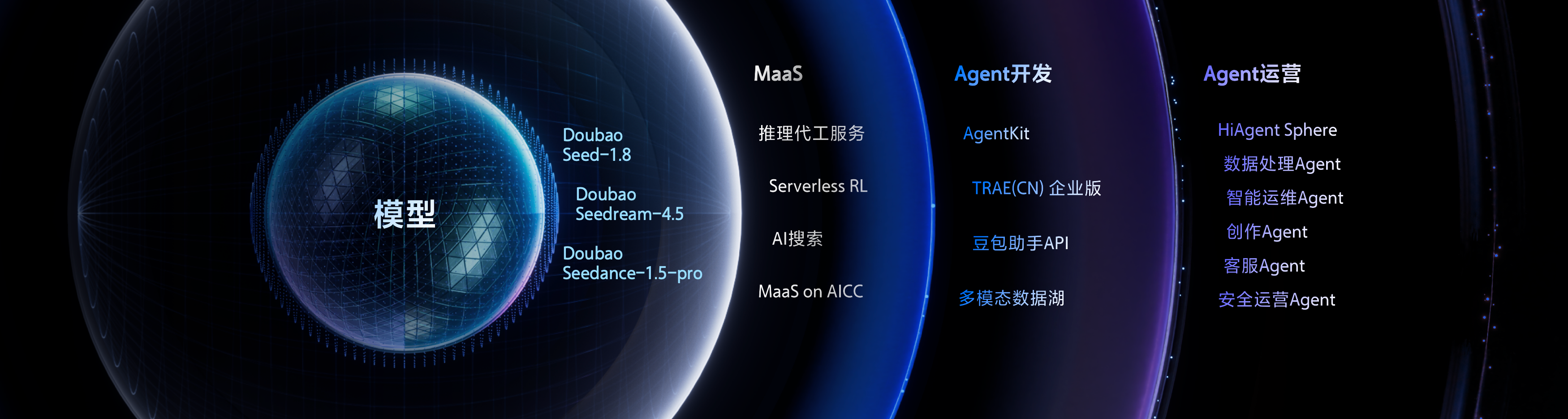 基于AI云,火山引擎构建起三层服务架构:在模型能力的支持下,以模型服务为核心的MaaS层、Agent开发服务层和Agent运营服务层。