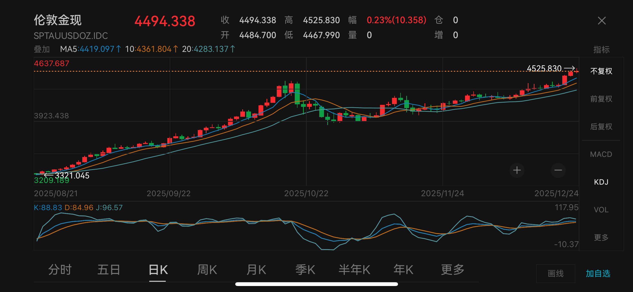 Wind数据显示,截至发稿(12月24日20:00),COMEX黄金期货盘中最高达4555.1美元/盎司。伦敦金现盘中最高达4525.83美元/盎司,较年初(1月2日)增长70.91%。