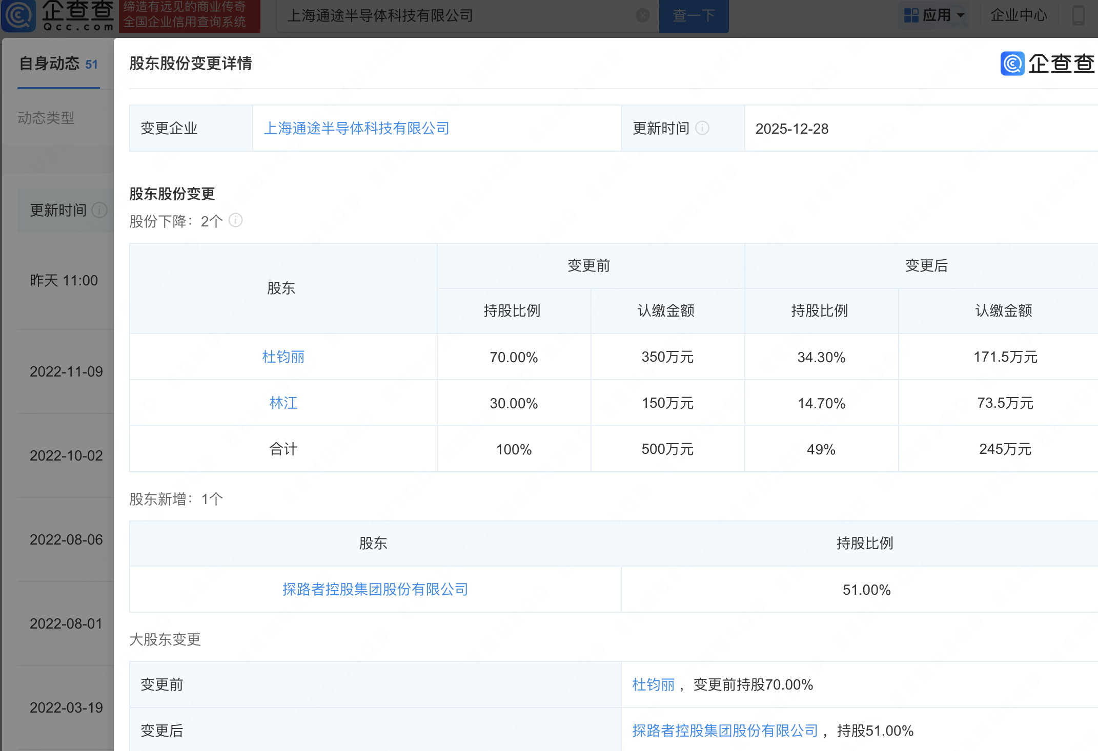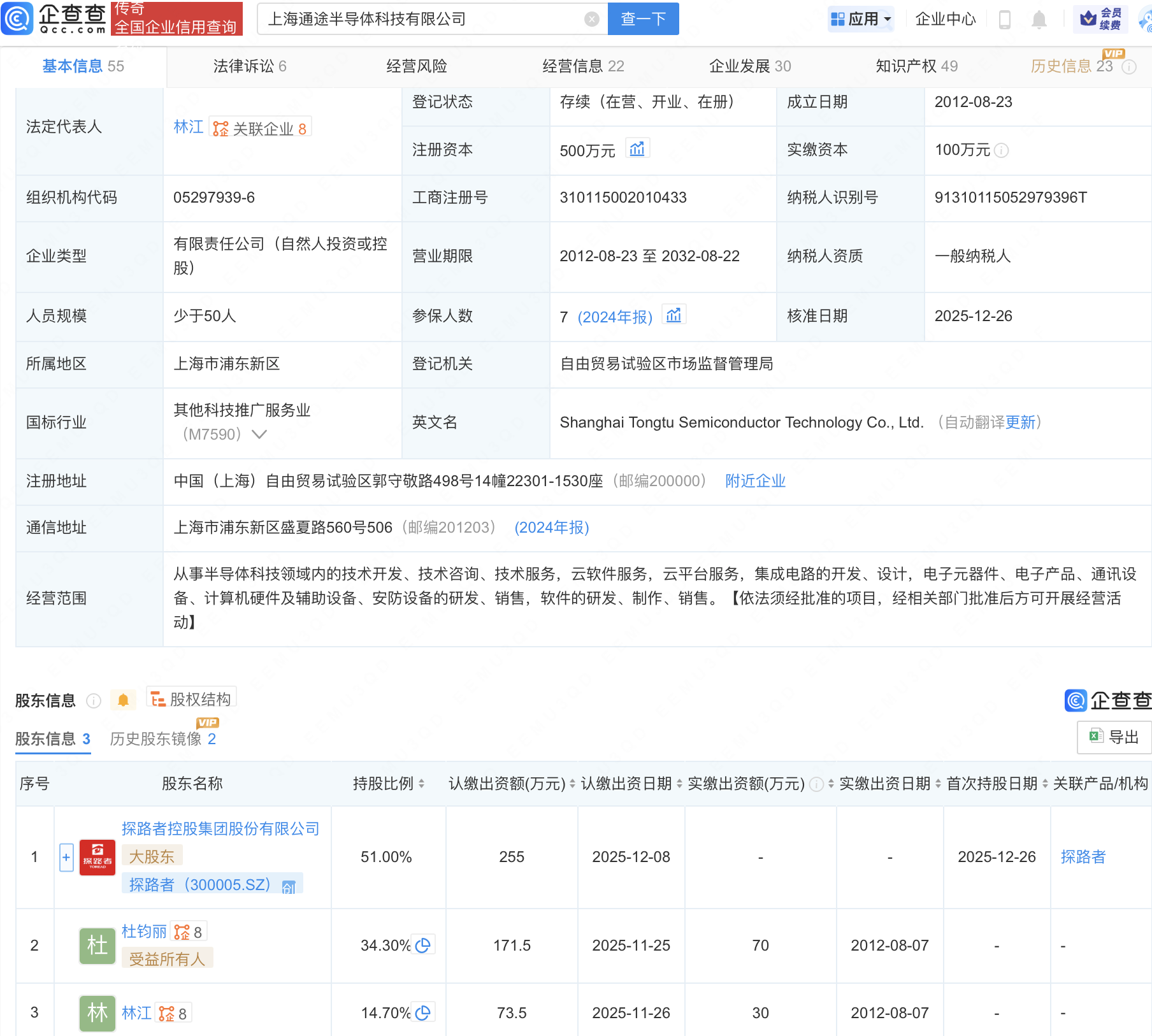 企查查APP显示,近日,上海通途半导体科技有限公司发生工商变更,新增探路者(300005)为大股东,持股51%。企查查信息显示,该公司成立于2012年,法定代表人为林江,经营范围包含:从事半导体科技领域内的技术开发、技术咨询、技术服务等。据其官网,通途半导体专注于芯片设计、计算机视觉IP授权、AI 软硬件系统、高清智能显示技术的创新和应用。