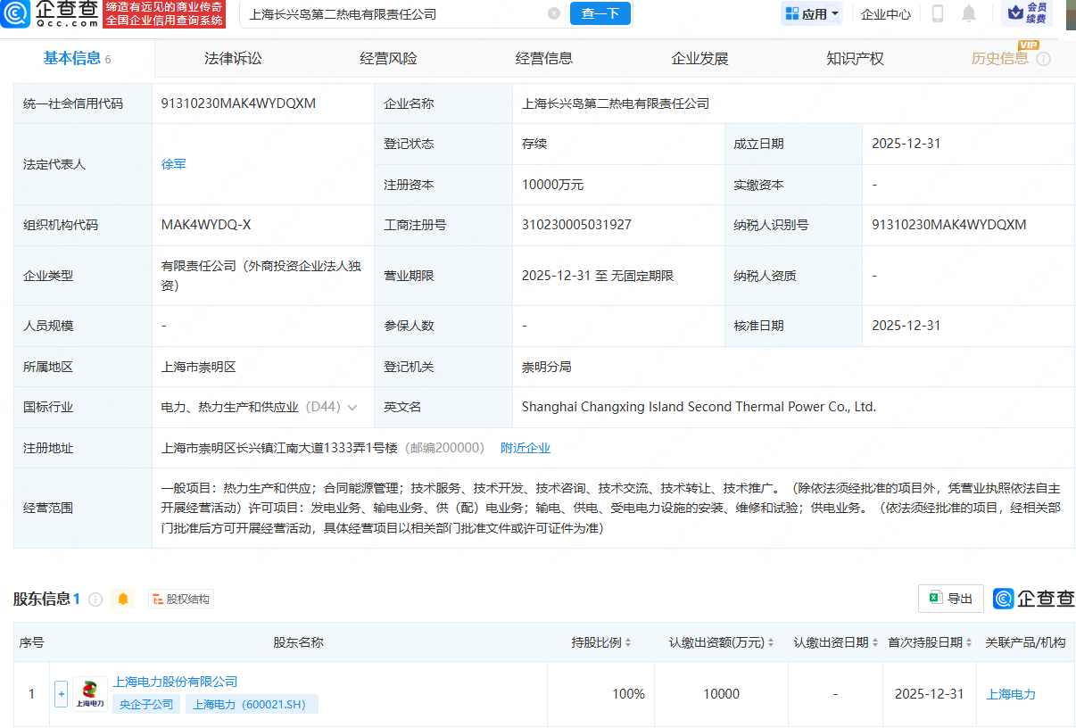 企查查APP显示,近日,上海长兴岛第二热电有限责任公司成立,法定代表人为徐军,注册资本为1亿元,经营范围包含:热力生产和供应;合同能源管理;发电业务、输电业务、供(配)电业务;供电业务等。企查查股权穿透显示,该公司由上海电力(600021)全资持股。