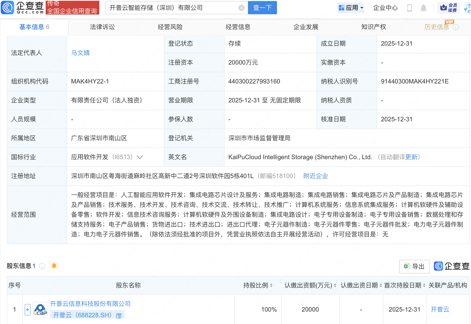企查查APP显示,近日,开普云智能存储(深圳)有限公司成立,注册资本2亿元,经营范围包含:人工智能应用软件开发;集成电路芯片设计及服务;集成电路制造;集成电路销售;集成电路芯片及产品制造等。企查查股权穿透显示,该公司由开普云(688228)全资持股。