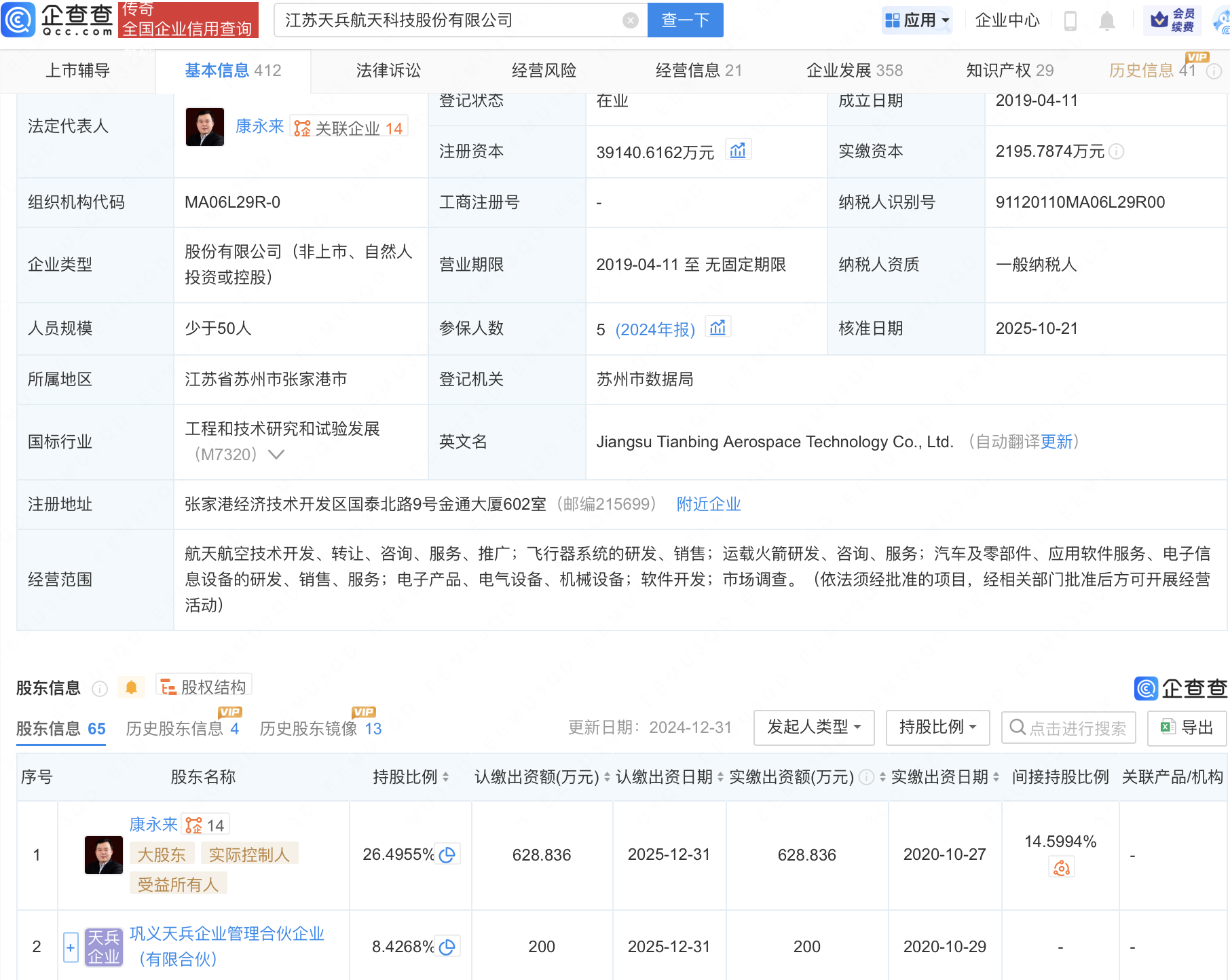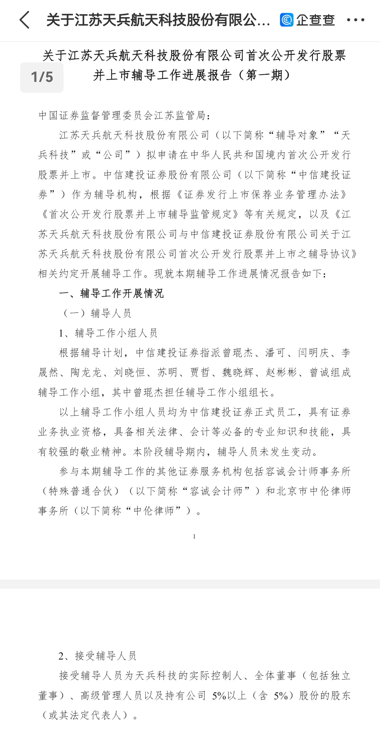 企查查APP显示,近日,江苏天兵航天科技股份有限公司公示IPO上市辅导进展报告(第一期),中信建投(601066)作为辅导机构,参与本期辅导工作的其他证券服务机构包括容诚会计师事务所(特殊普通合伙)和北京市中伦律师事务所,接受辅导人员为天兵科技的实际控制人、全体董事(包括独立董事)、高级管理人员以及持有公司 5%以上(含 5%)股份的股东(或其法定代表人)。企查查信息显示,该公司成立于2019年,法定代表人为康永来,经营范围包含:航天航空技术开发、转让、咨询、服务、推广;运载火箭研发、咨询、服务等,由康永来持股26.5%。