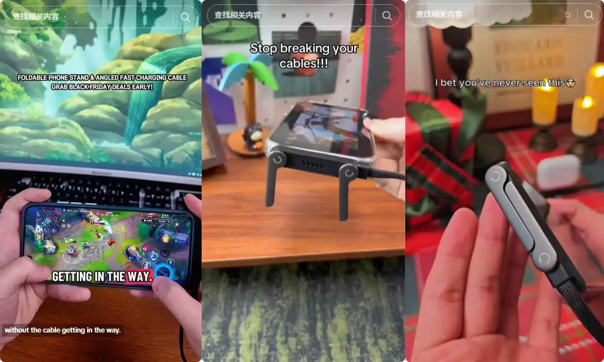 海外达人展示传统数据线与折叠支架数据线的使用差别(图片来自TikTok)