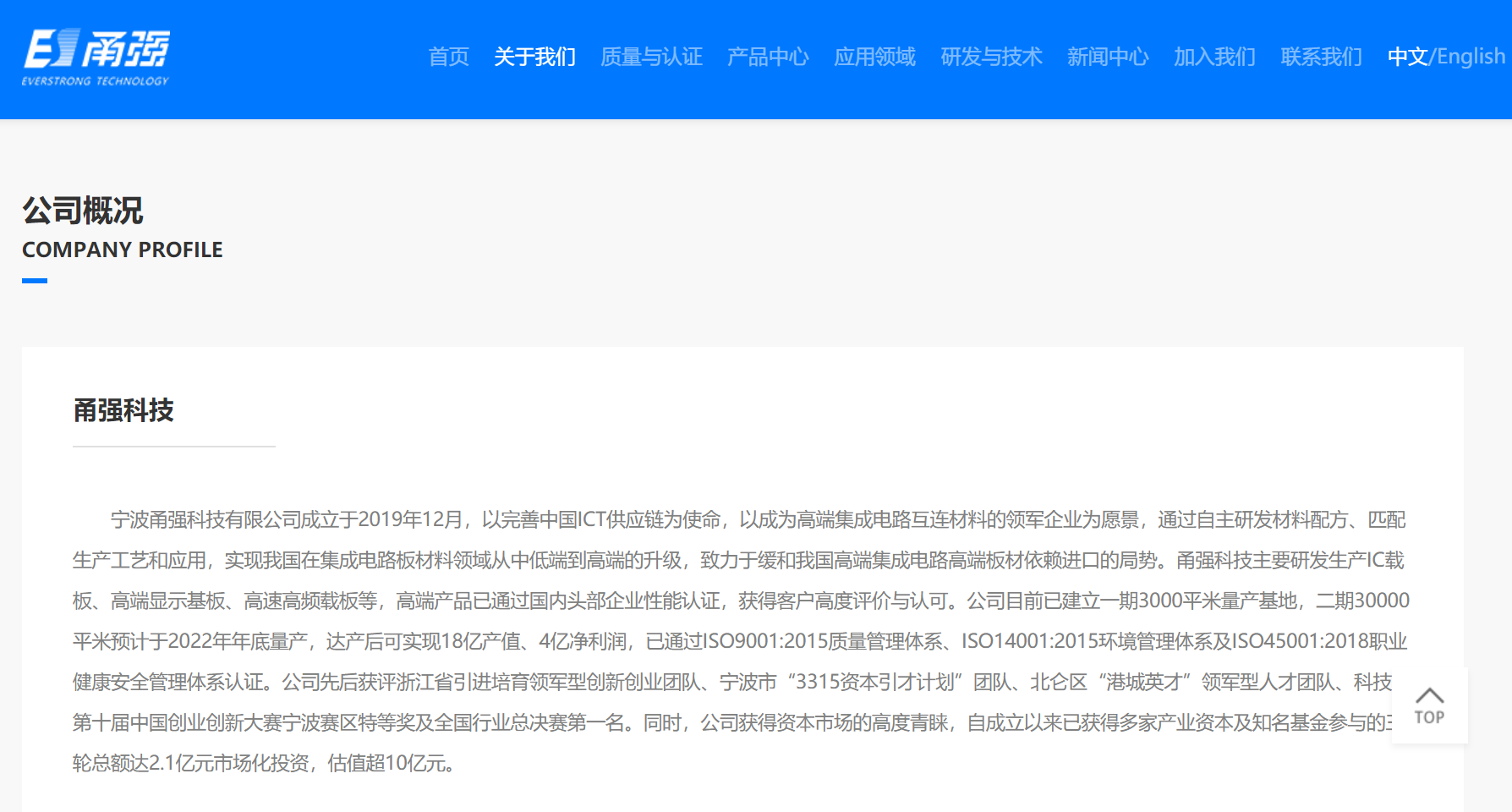 据甬强科技官网披露,公司自成立以来已获得多家产业资本及知名基金参与的三轮总额达2.1亿元市场化投资,估值超10亿元。