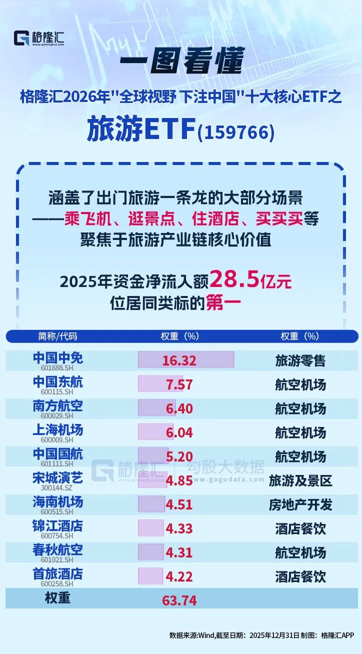 值得注意的是,旅游(159766)也入选了格隆汇研究院2026年“全球视野,下注中国”十大核心ETF。