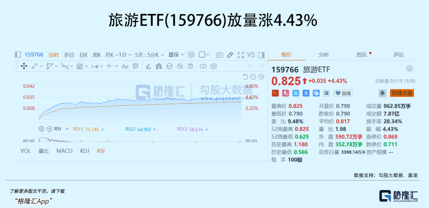 其中,旅游ETF(159766)放量大涨4.43%。