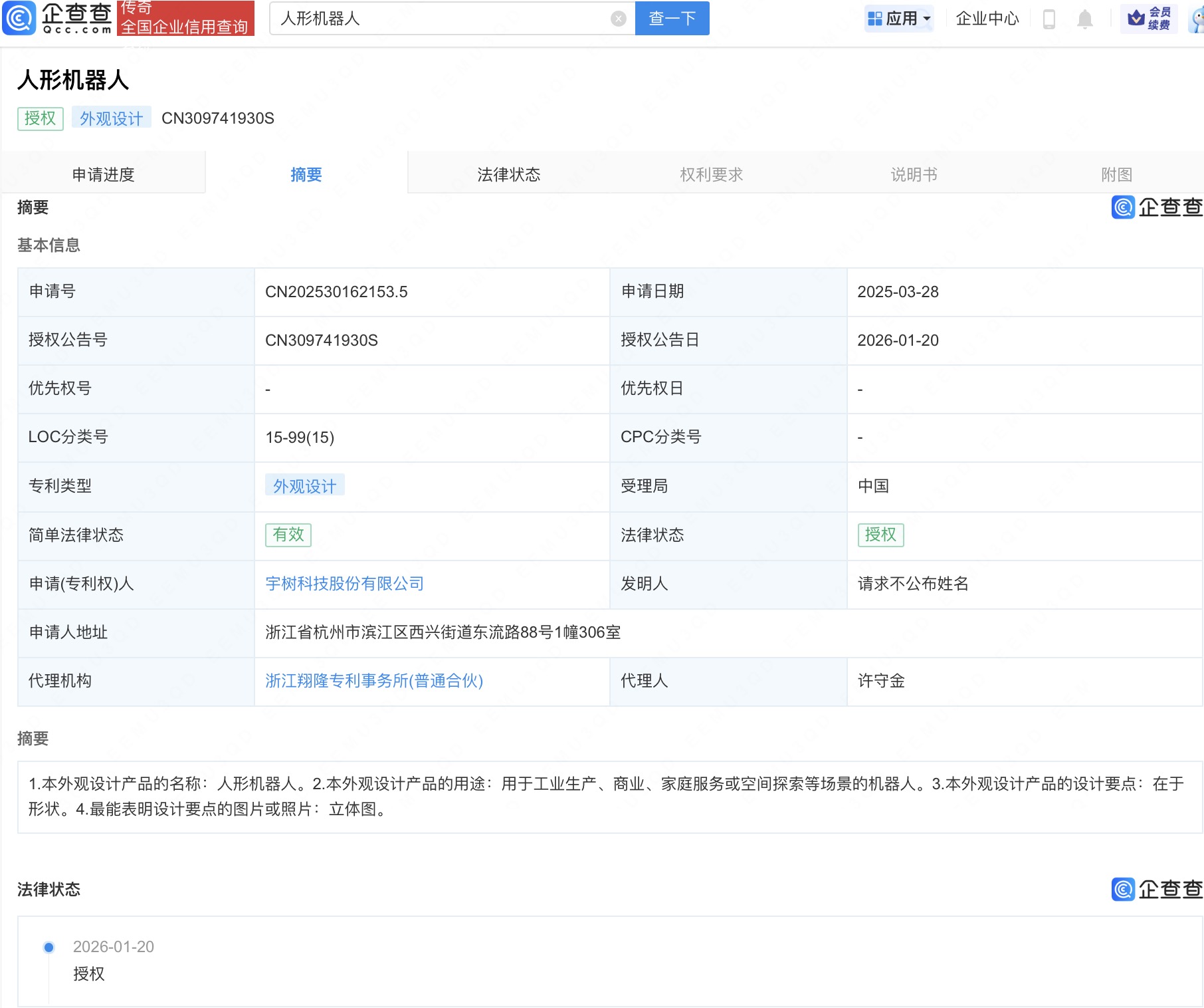 企查查APP显示,近日,宇树科技股份有限公司“人形机器人”外观设计专利获授权。企查查专利摘要显示,本外观设计产品的用途为用于工业生产、商业、家庭服务或空间探索等场景的机器人,设计要点在于形状。