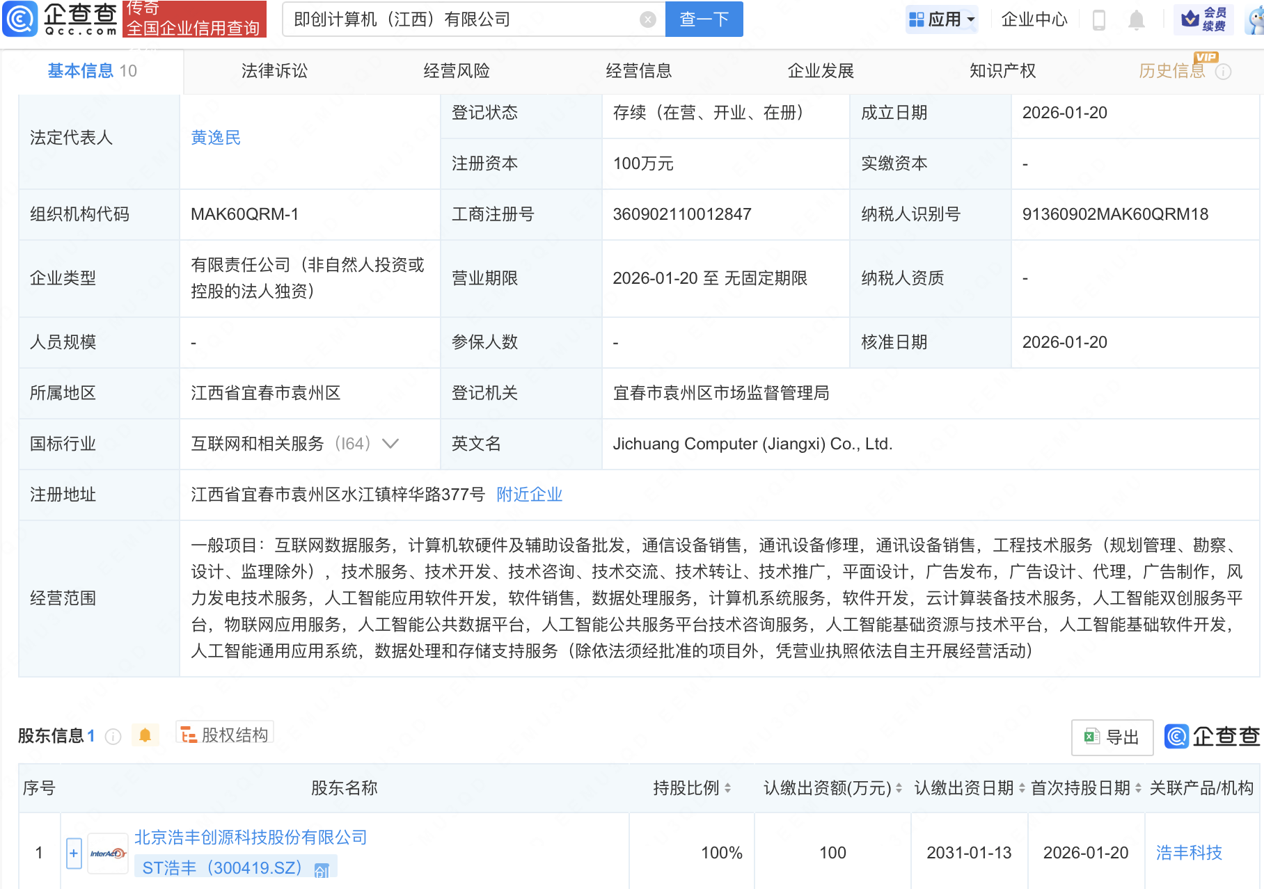 企查查APP显示,近日,即创计算机(江西)有限公司成立,经营范围包含:人工智能双创服务平台,物联网应用服务,人工智能公共数据平台,人工智能公共服务平台技术咨询服务等。企查查股权穿透显示,该公司由ST浩丰(300419)全资持股。