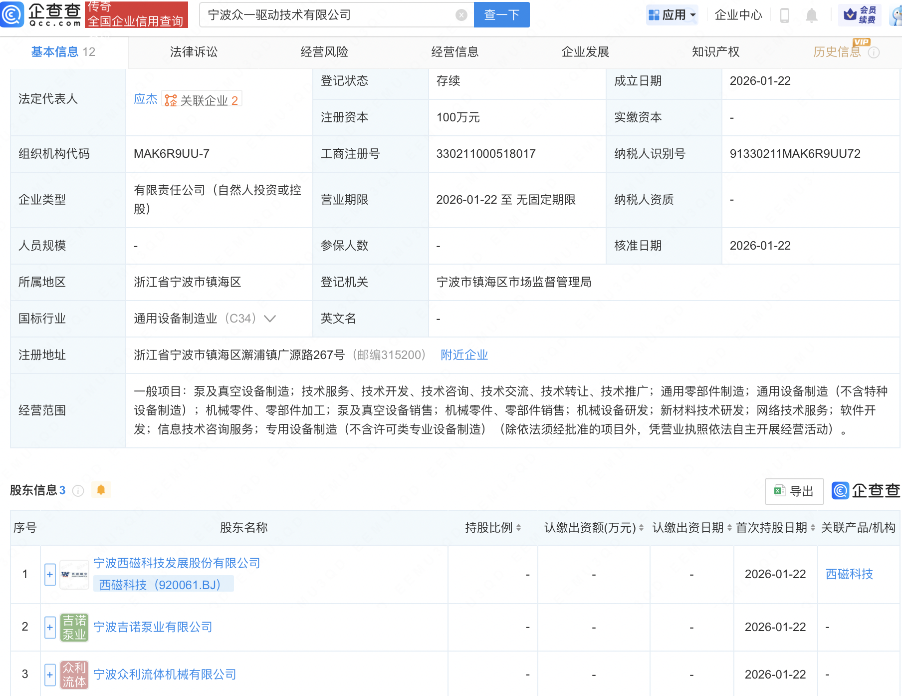 企查查APP显示,近日,宁波众一驱动技术有限公司成立,经营范围包含:机械设备研发;新材料技术研发;网络技术服务;软件开发等。企查查股权穿透显示,该公司由西磁科技(920061)等共同持股。