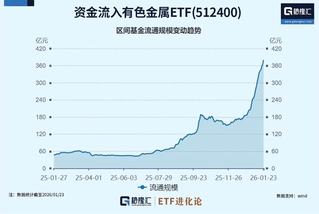 在资金蜂拥而入的背景下,规模变化同样出现了暴增。截至2024年底,有色金属ETF(512400)的规模为43.65亿元;而截至1月23日,其规模已增长至380.03亿元。短短一年时间暴增771%,成为市场规模最大的有色金属主题ETF。