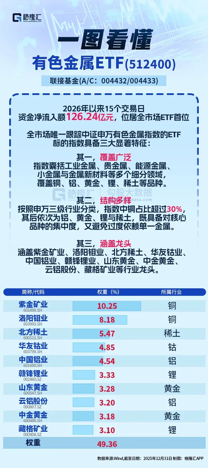 其三,涵盖龙头。指数共包含50只成份股,单一成份权重不超过10%,前十大成份股合计占比49%,覆盖紫金矿业、洛阳钼业、北方稀土、华友钴业、中国铝业、赣锋锂业、山东黄金、中金黄金、云铝股份、藏格矿业等行业龙头。