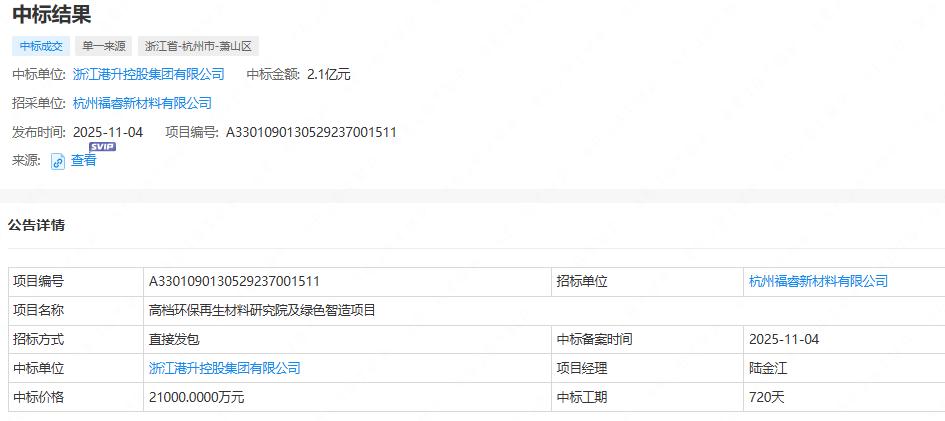 企查查显示,2025年11月4日的中标结果显示,研究院及绿色智造项目直接发包给了浙江港升控股集团有限公司(下称:浙江港升),金额为2.1亿元。浙江港升也是色纺面料一体化项目的建设公司。