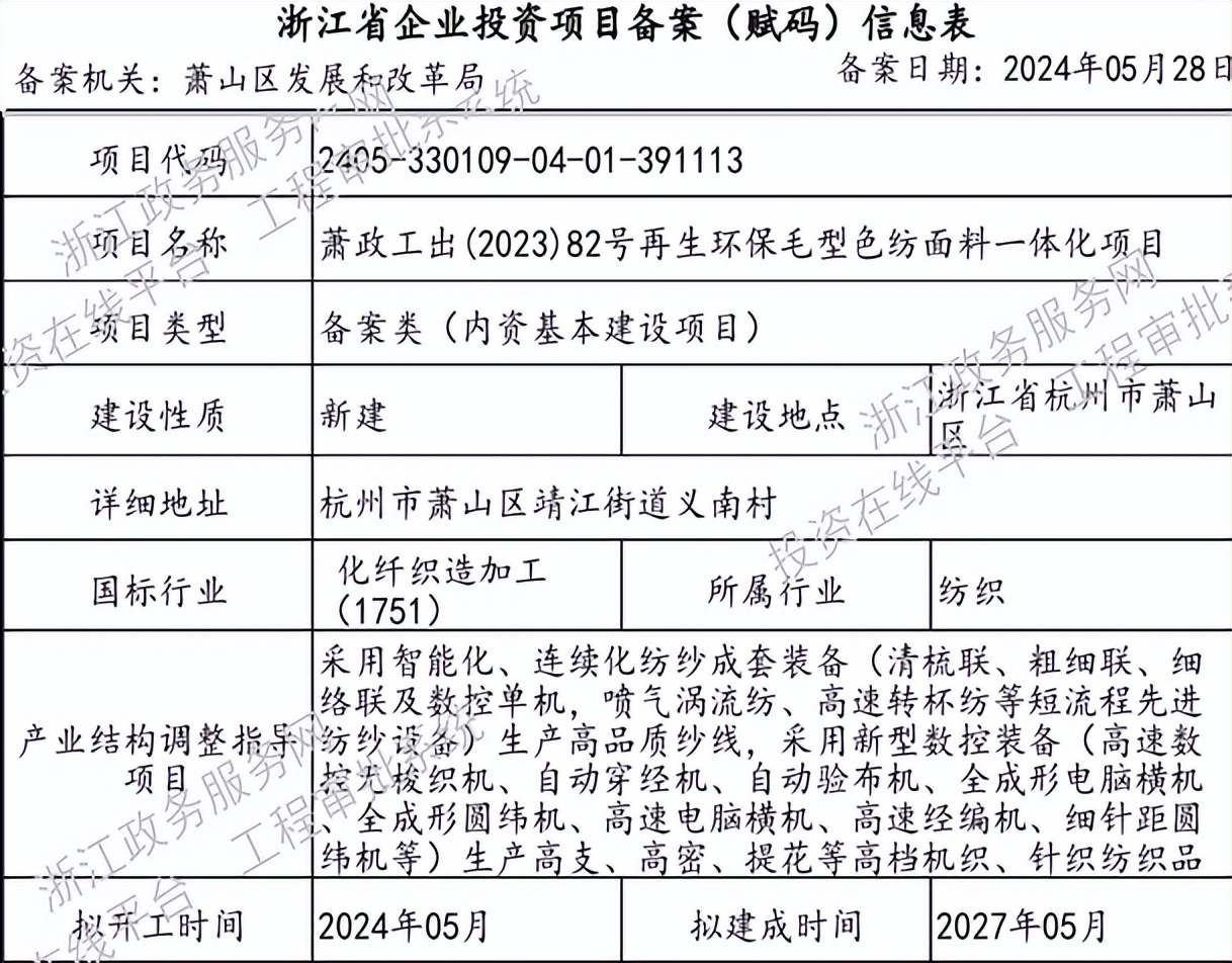 另外,色纺面料一体化项目于2024年5月28日也才完成备案,备案文件显示,色纺面料一体化项目为新建项目,建设期为36个月,比招股书披露的建设期长了12个月。