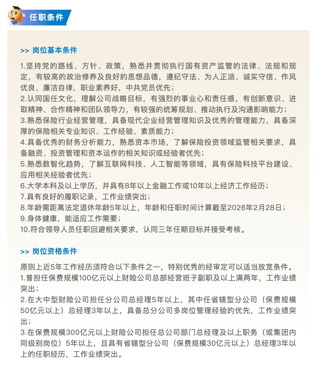 公告对候选人提出“三大硬条件”,聚焦“百亿保费规模”“省级分公司总经理”“多岗位管理经验”等关键词,并优先考虑熟悉保险科技和数智化转型的领军人才。