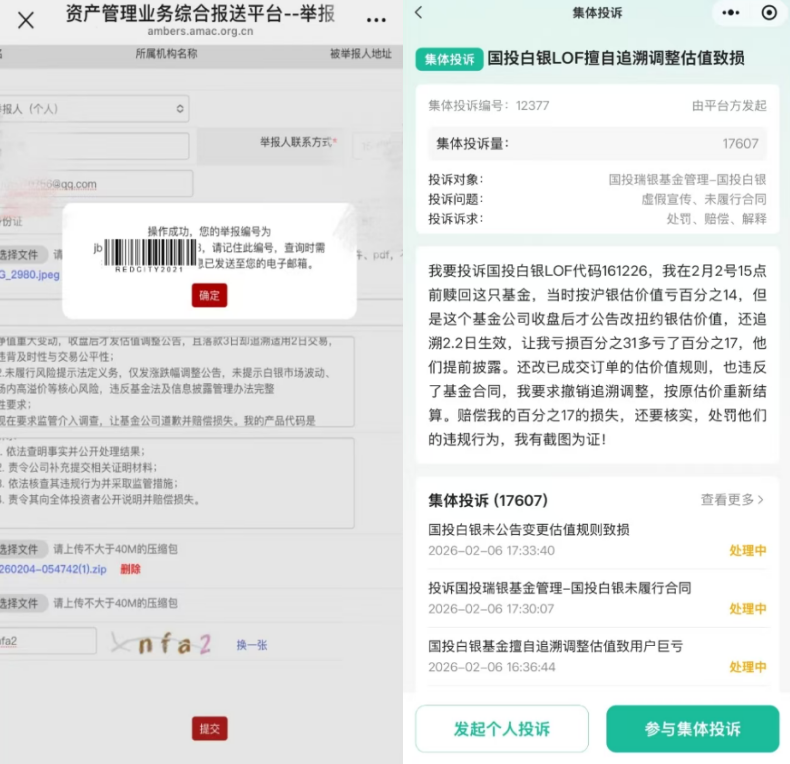 在白银价格下跌及净值调整双重因素作用下,购买该基金的投资者收益大幅缩水。许多投资者“抱团”进行举报与投诉,也有大量投资者以个人名义进行投诉。
