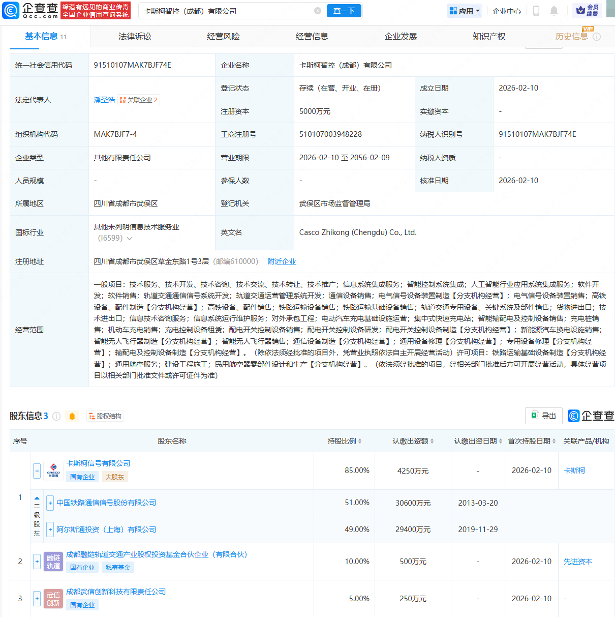 企查查APP显示,近日,卡斯柯智控(成都)有限公司成立,法定代表人为潘圣浩,注册资本为5000万元,经营范围包含:智能控制系统集成;人工智能行业应用系统集成服务;轨道交通通信信号系统开发;集中式快速充电站等。企查查股权穿透显示,该公司由中国通号(688009)旗下卡斯柯信号有限公司、成都融链轨道交通产业股权投资基金合伙企业(有限合伙)等共同持股。