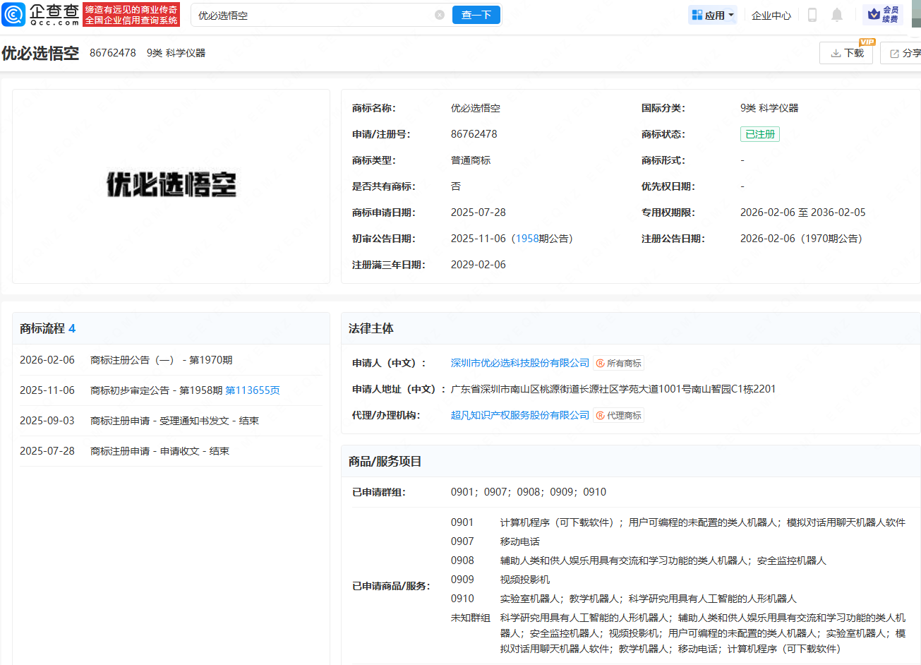 企查查APP显示,近日,优必选(09880.HK)申请的“优必选悟空”商标注册成功,国际分类为9类 科学仪器,已申请商品/服务包括:安全监控机器人;实验室机器人;教学机器人;科学研究用具有人工智能的人形机器人等。