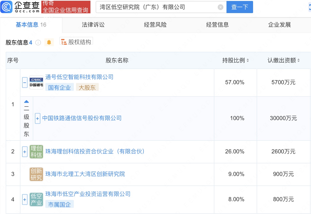 企查查APP显示,近日,湾区低空研究院(广东)有限公司成立,法定代表人为孙晓光,注册资本1亿人民币,经营范围含人工智能行业应用系统集成服务、人工智能应用软件开发、飞行训练、旅游业务等。企查查股权穿透显示,该公司由中国通号(688009)全资子公司通号低空智能科技有限公司、珠海市北理工大湾区创新研究院等共同持股。