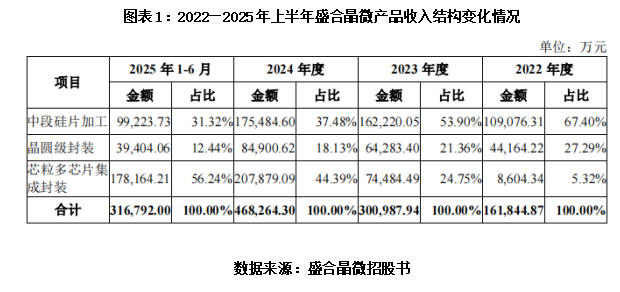 更值得警惕的是,盛合晶微毛利率的飙升更多并非源于技术溢价,而是单一客户驱动下业务结构的被动调整。招股书显示,盛合晶微的收入主要分为三大板块:中段硅片加工、晶圆级封装、芯粒多芯片集成封装。2022年,中段硅片加工是其核心收入来源,收入占比达67.40%;但到2025年上半年,这一比例骤降至31.32%,同期晶圆级封装收入占比也从27.29%降至12.44%。与之形成反差的是,芯粒多芯片集成封装业务收入占比从2022年的5.32%急升至56.24%,成为营收增长的绝对主力。表面上看,这是向高附加值业务转型的成果,但本质上,该业务的爆发完全依赖客户A的订单驱动,而非市场需求的广泛认可——一旦客户A减少相关订单,盛合晶微的毛利率将难以维持当前水平,所谓的“盈利改善”也将失去核心支撑,盈利稳定性无从谈起。