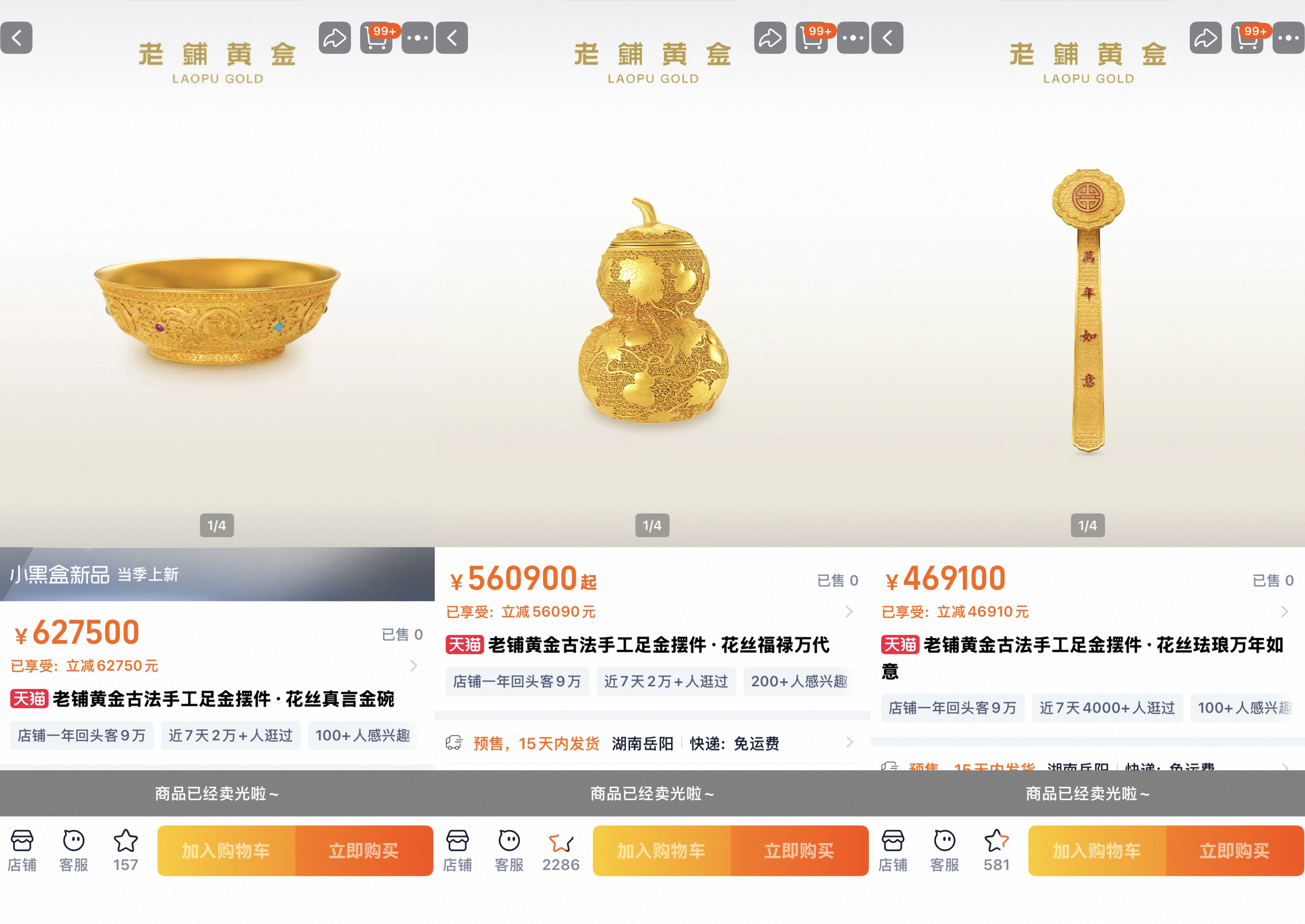 不仅仅是线下销售火爆,老铺黄金线上渠道同样一货难求。2月26日14时,老铺黄金天猫旗舰店开启“满1000-100”促销活动,开售不到10分钟,店铺多个商品链接显示售罄或下架,其中包括62万元的“花丝金碗”、56万元的“福禄摆件”等高价单品。