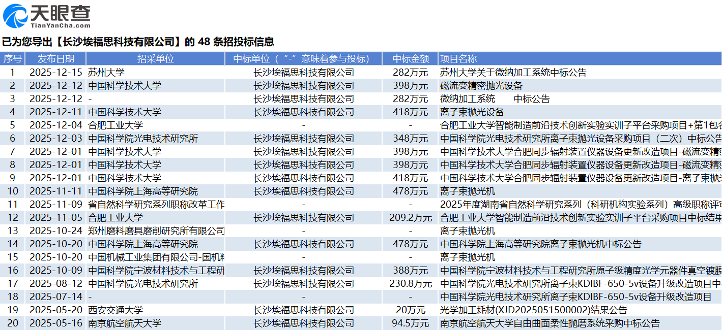 此外,时代周报记者通过天眼查发现,仅2025年埃福思就中标了多家高校的采购项目,包括南京航空航天大学、西安交通大学、中国科学院光电技术研究所、合肥工业大学、中国科学技术大学、苏州大学等。