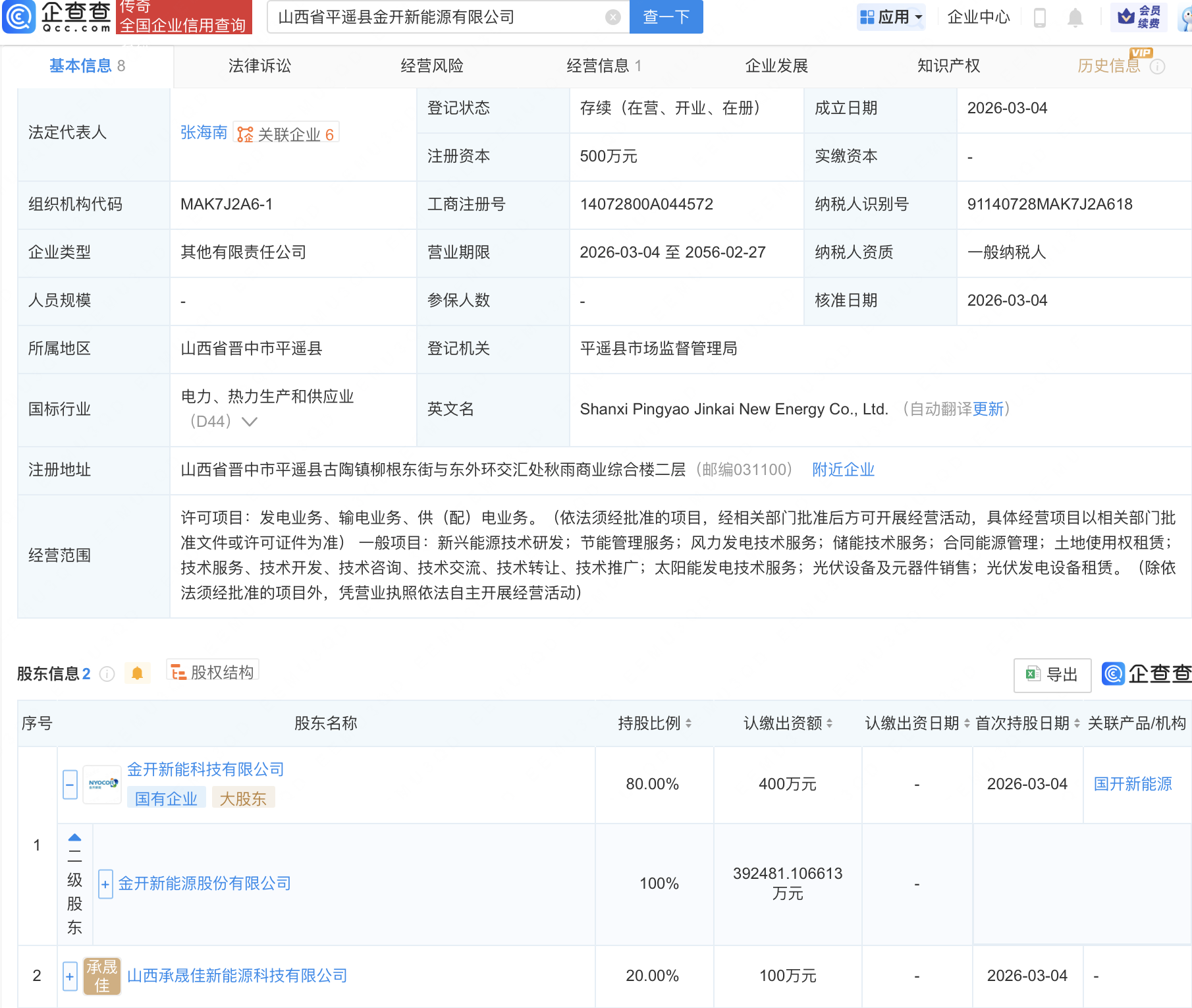 企查查APP显示,近日,山西省平遥县金开新能源有限公司成立,经营范围包含:新兴能源技术研发;节能管理服务;风力发电技术服务;储能技术服务;合同能源管理等。企查查股权穿透显示,该公司由金开新能(600821)全资子公司金开新能科技有限公司等共同持股。