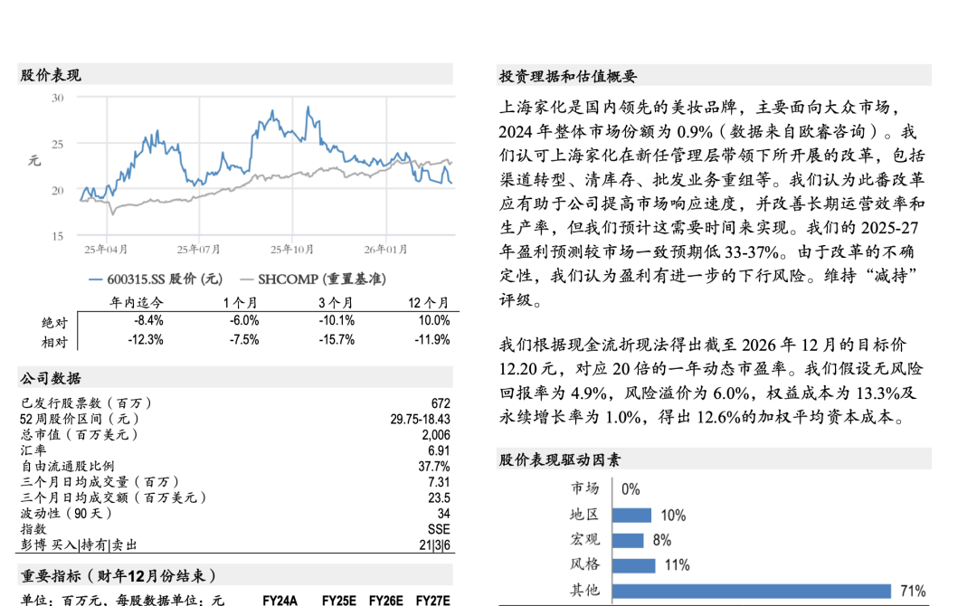 上海家化目前股价对应23倍的2027年预期市盈率(基于彭博一致预期),而行业均值为17倍。我们认为其增长状况不能证明溢价的合理性。我们将2025-26年盈利预测下调24-25%,以反映竞争加剧以及重振品牌需要大量的资源。我们的估算值比市场一致预期低33-37%。我们将估值期限延至2026年12月,并基于现金流折现法得出新目标价12.20元,对应20倍的12个月动态市盈率。维持“减持”评级。