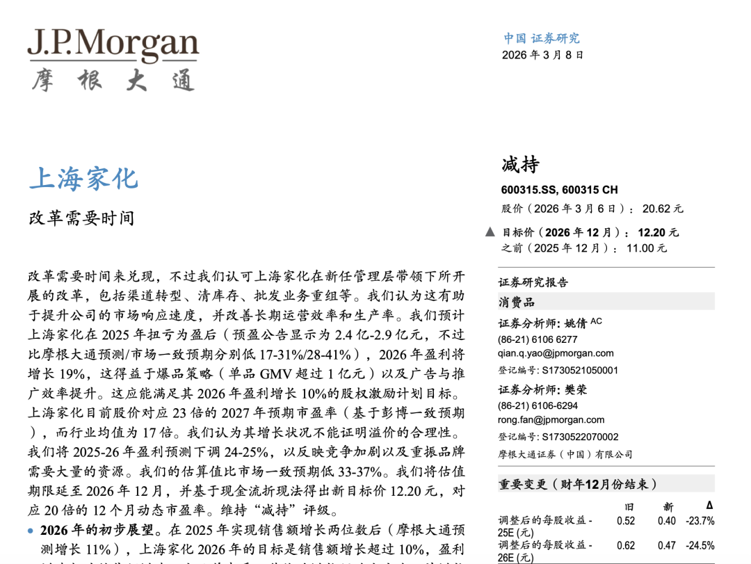近期,摩根大通发布研报称上海家化改革需要时间,给予减持评级。