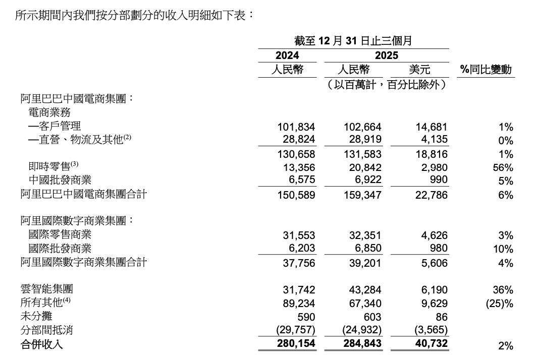 阿里巴巴2026财年第三财季收入明细