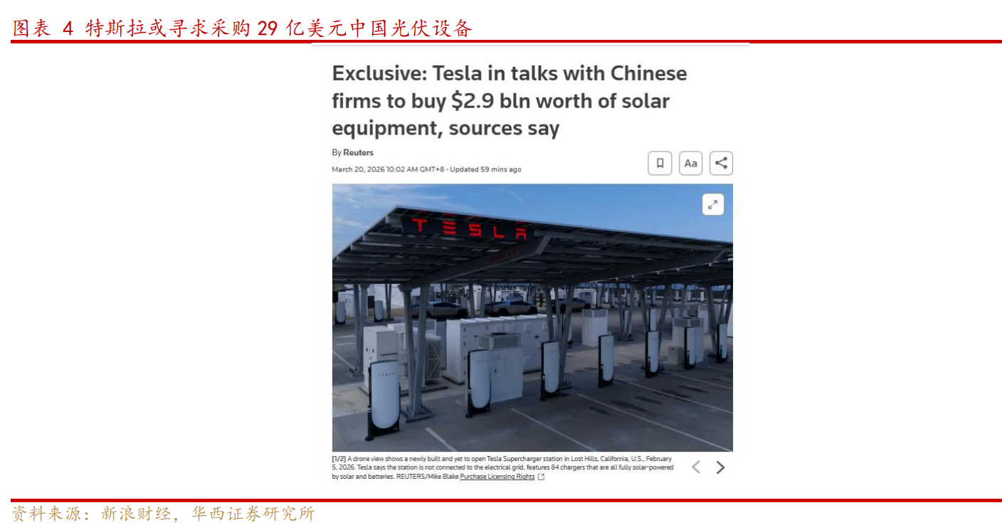 根据国金证券,特斯拉拟向中国光伏设备企业采购29亿美元生产设备,用于加速美国本土光伏产能布局,这一计划服务于其2028年底前在美国建成100GW光伏制造能力的长期目标,既满足自身能源需求,也可支撑SpaceX卫星供电。