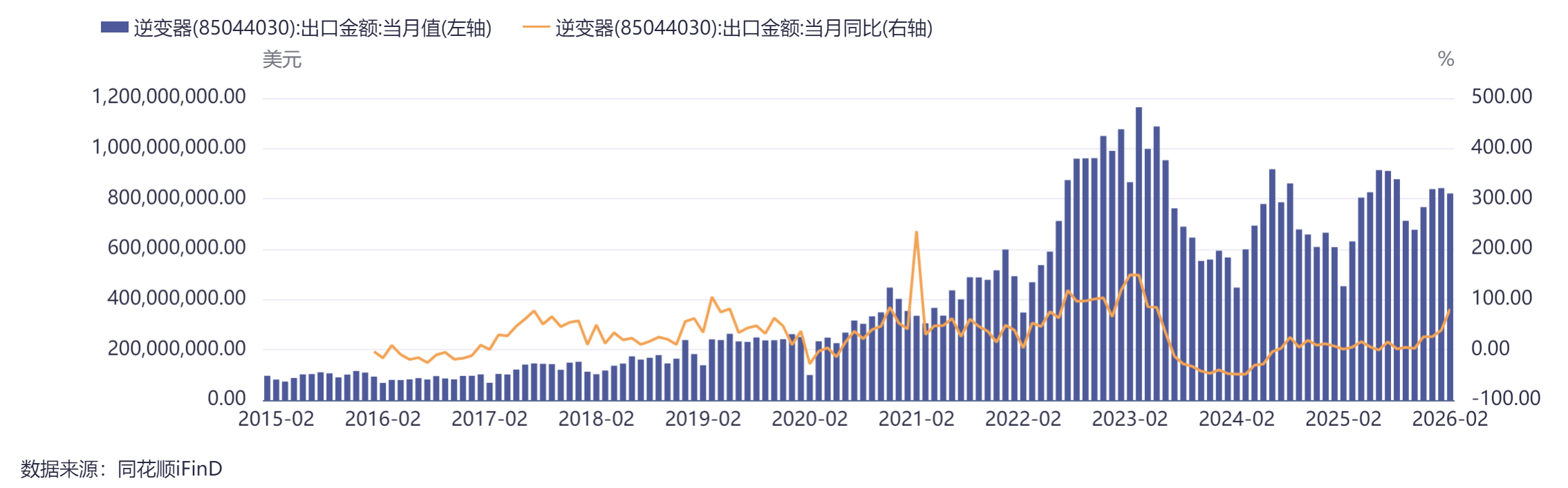 根据海关总署数据,2026年1至2月我国逆变器出口额合计16.6亿美元,同比增长56.9%。其中,2月出口额为8.2亿美元,同比增长高达81.4%,这一数据进一步强化了光伏行业景气预期。