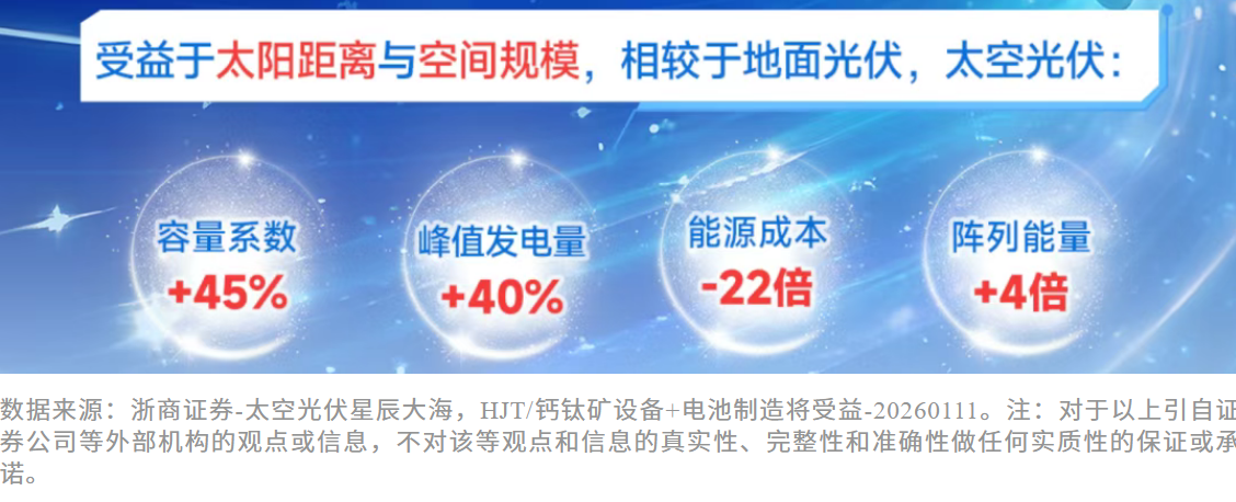 由于数据中心耗电量巨大,电力短缺已成为当前制约数据中心大规模建设和运营的主要因素。根据湘财证券,太空算力具备散热效率高、全生命周期低成本、使用空间充足等优势,已成为未来建设数据中心的重要方向之一。而光伏作为太空数据中心的主要发电方式,有望充分受益太空算力发展。