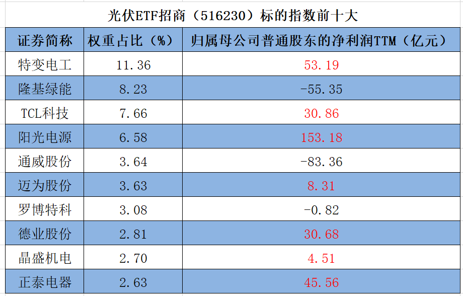 从光伏ETF招商(516230)跟踪的中证光伏产业指数来看,过去12个月前十大中归属母公司普通股东的净利润有7家净利润居正,相较于2025年业绩明显改善。