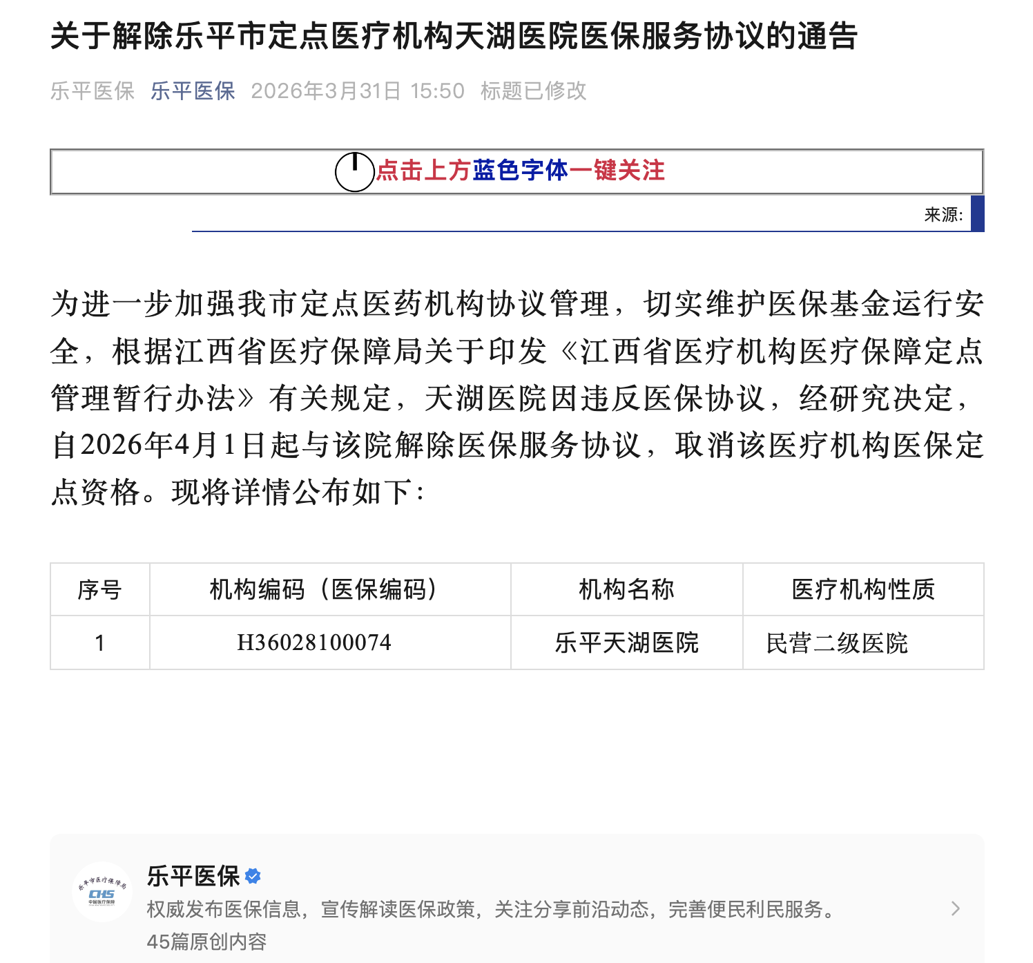 3月31日,“乐平医保”官方发布的《关于解除乐平市定点医疗机构天湖医院医保服务协议的通告》提到,根据江西省医疗保障局关于印发《江西省医疗机构医疗保障定点管理暂行办法》有关规定,天湖医院因违反医保协议,经研究决定,自2026年4月1日起与该院解除医保服务协议,取消该医疗机构医保定点资格。