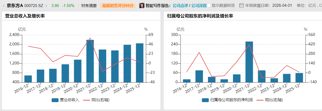 此前,3月31日晚,京东方披露了2025年年报,公司全年实现营收2045.90亿元,同比增长3.13%;实现归母净利润58.57亿元,同比增长10.03%;实现扣非净利润42.30亿元,同比增长10.25%。