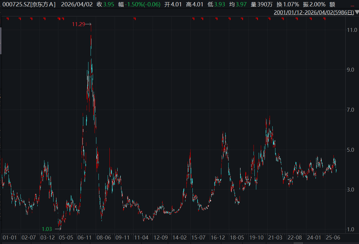 而从股价表现来看,京东方上市至今股价最高涨至11.29元/股,大部分时间均在1元/股至6元/股之间涨跌,上市至今20余年复权涨跌幅为10.95%。