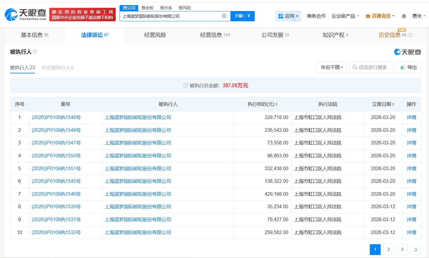 司法层面的风险更是雪上加霜。近期,上海蓝梦国际邮轮股份有限公司及新任法定代表人林恩杰,因未按执行通知书指定的期间履行生效法律文书确定的给付义务,被依法限制高消费。案件流程显示,今年2月,该公司已因相关案件被强制执行11万余元,而截至目前,公司名下已有20余条被执行人信息,涉及多起欠薪、合同纠纷,涉案金额累计超130万元,目前已有员工集体起诉立案,维权行动仍在持续推进。